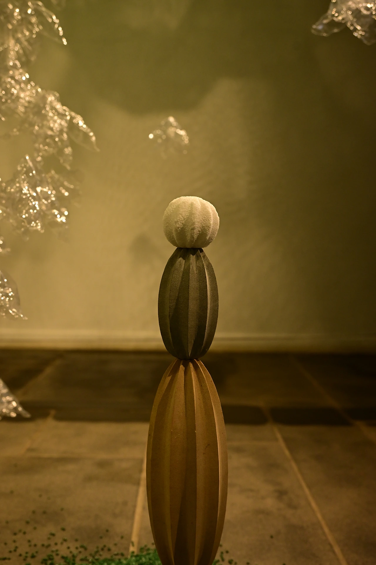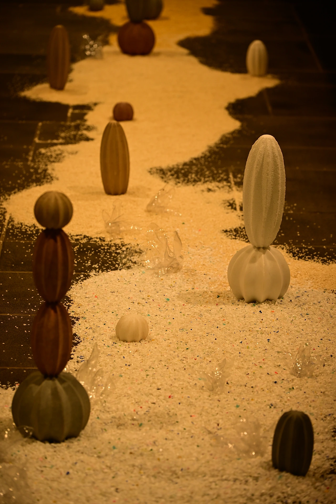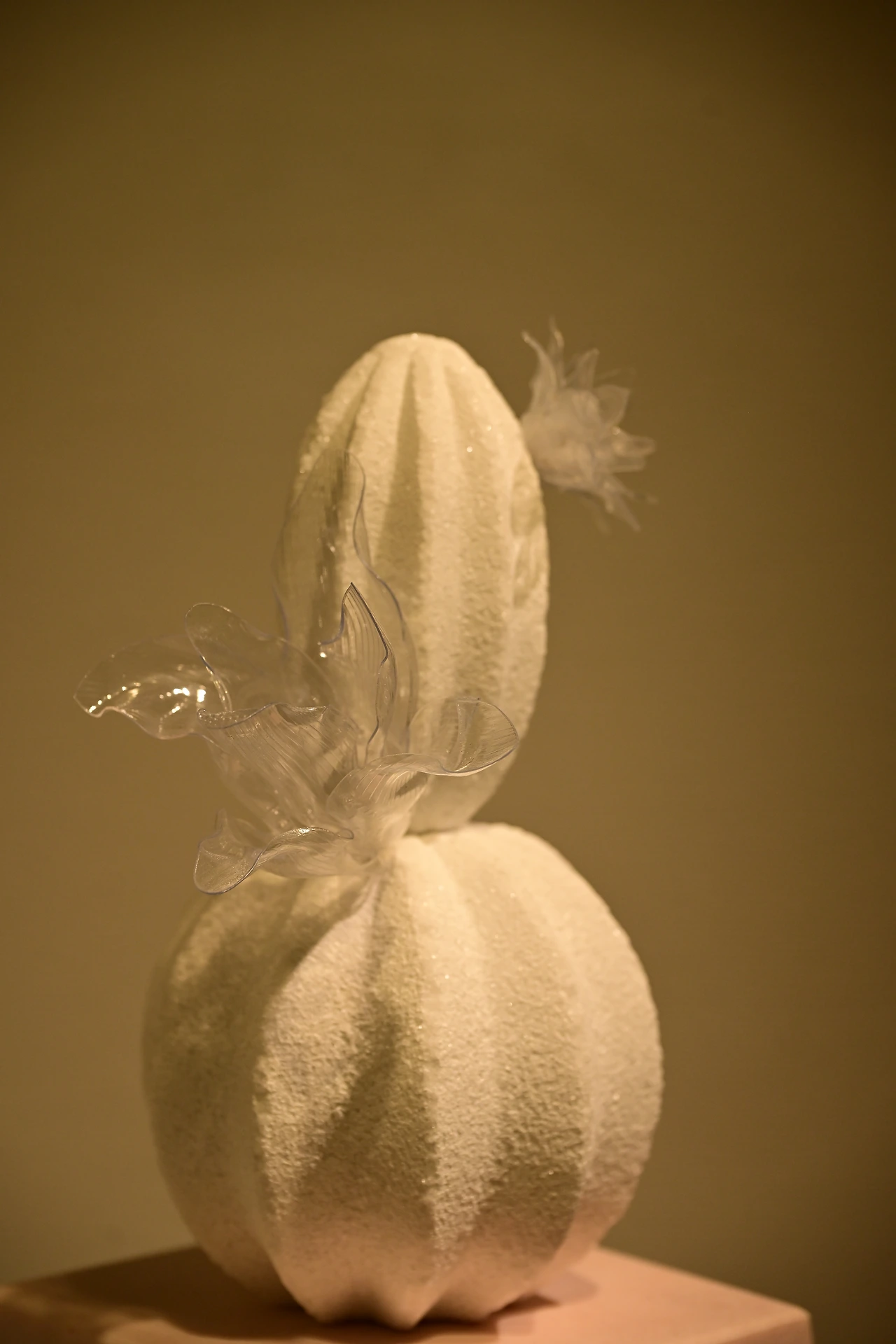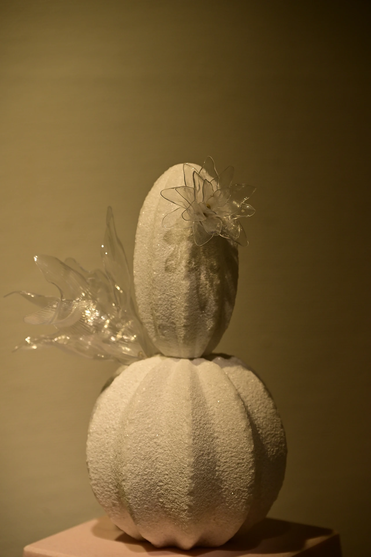 한쪽 귀퉁이에는 매끄러운 질감의 선인장이 놓여있는데 몸체에서 피어난 꽃이 플라스틱 조화였어요. 물과 벌이 사라진 환경에서도 꽃을 피우는 선인장. 생명탄생의 아이러니한 구조를 그 작품을 통해 떠올려 보게 되었죠. 사막의 등불이 되어주는 선인장의 탄생에 기생하는 플라스틱 꽃. 발화점이 없는데 피어나요. 수분매개체가 없는데 수정을 했어요. 그걸 품고 키워내는 백색의 선인장을 한참을 바라보았죠.