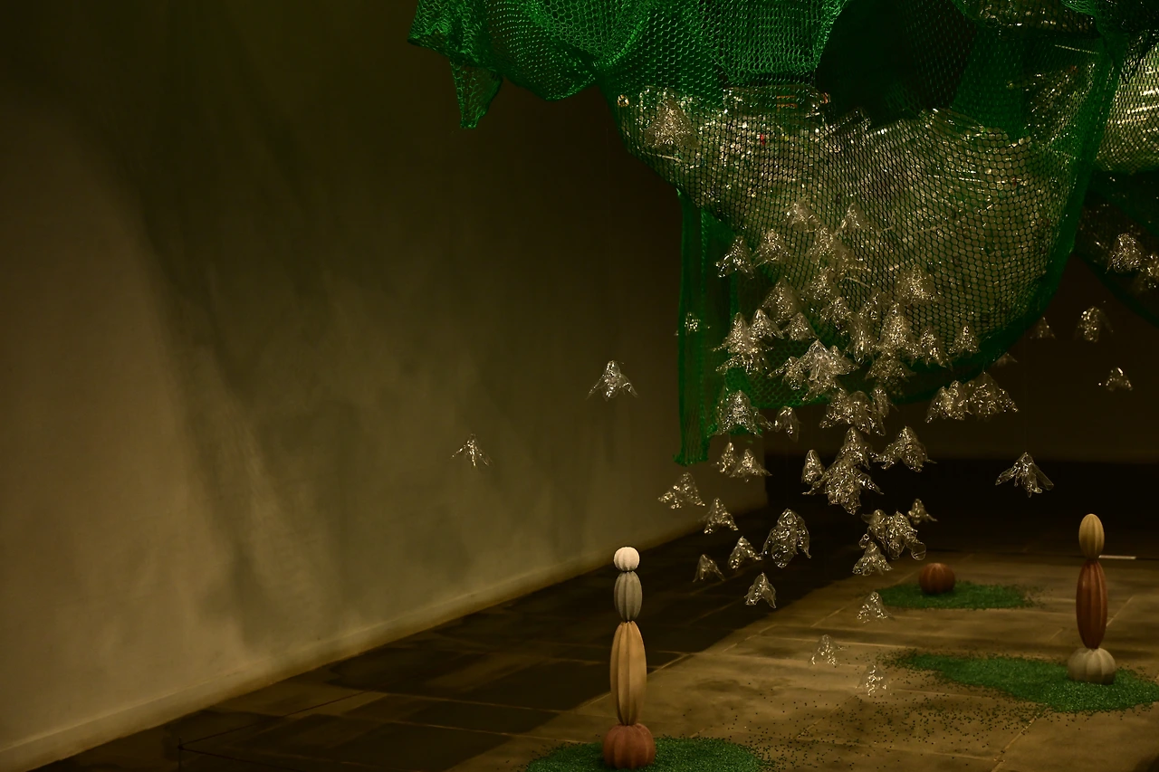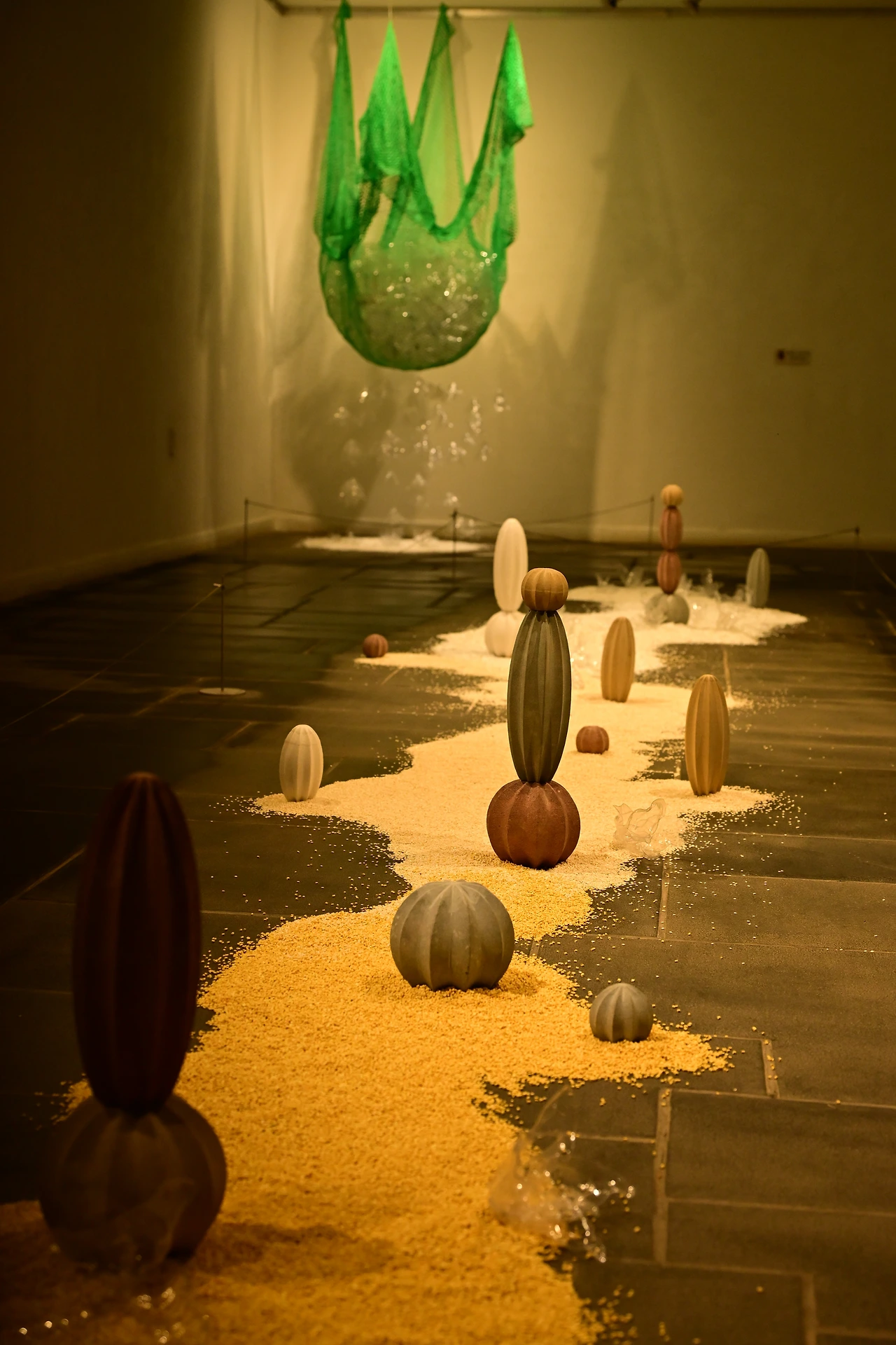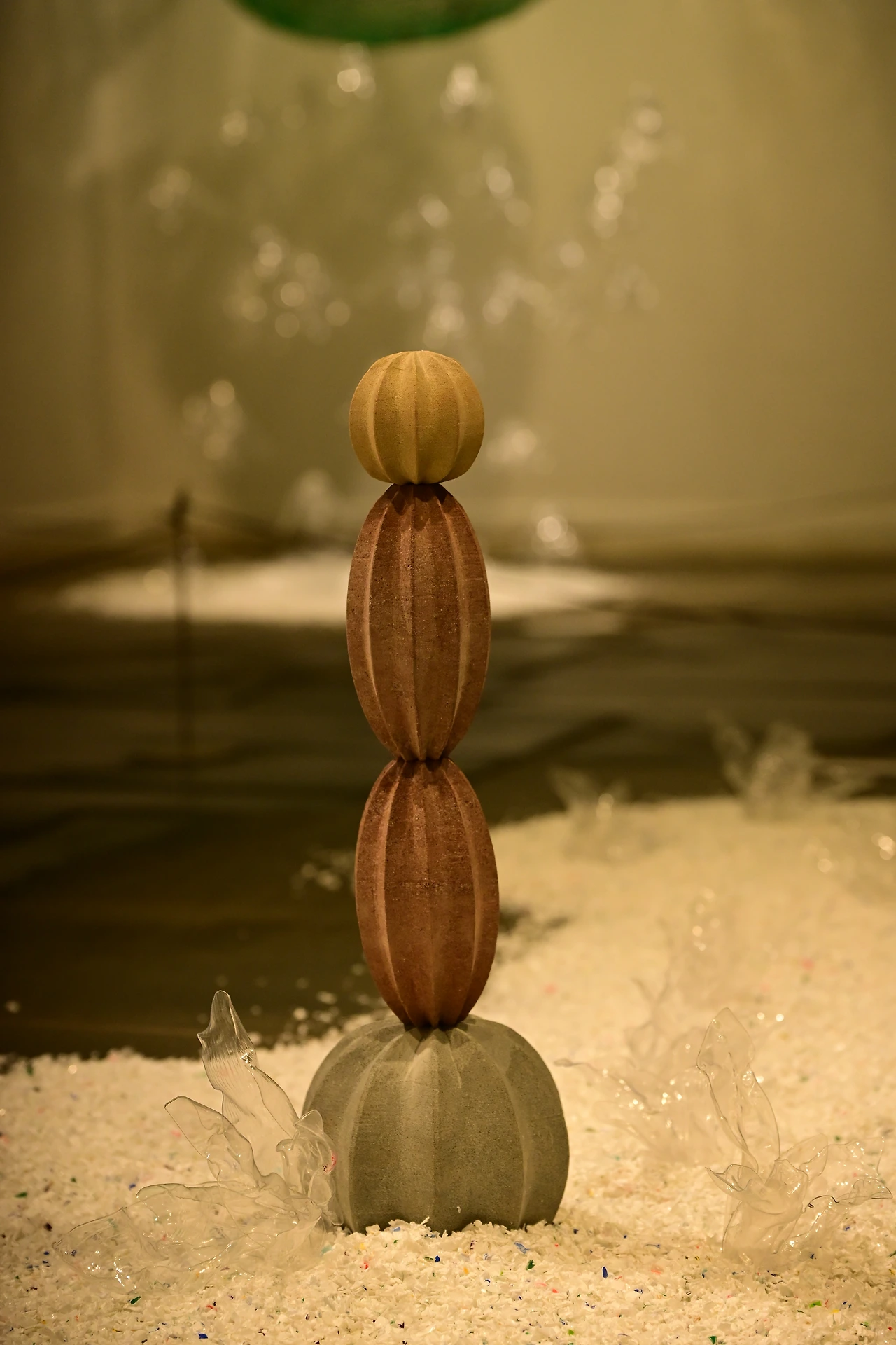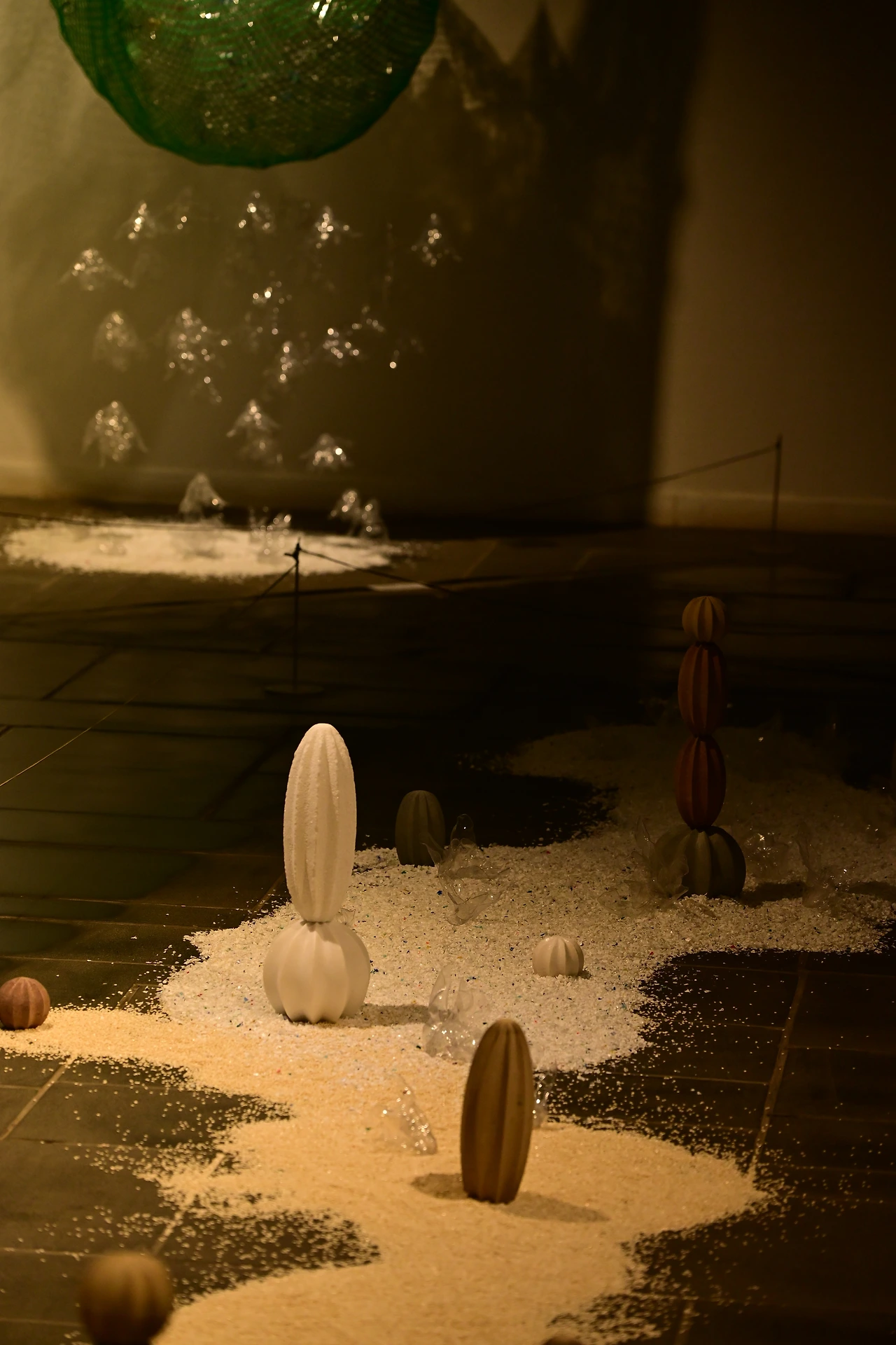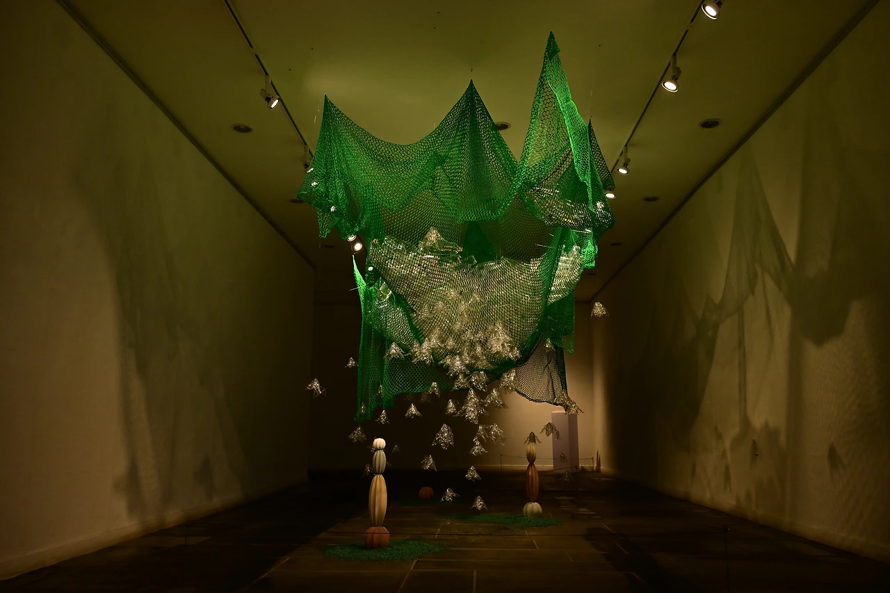 전시장에 들어서자마자 보이는 천장에 매달린 커다란 그물 안에는 플라스틱이 가득 채워져 있어요. 플라스틱의 투명한 몸체에 빛이 굴절되어 복도를 채우는데 그물의 녹빛과 섞여 들어 독특한 색감이 만들어졌죠. 플라스틱이 아니고 고기들이라면 만선이라 외치며 항구로 들어올 배의 그물에는 인간이 만들고 쓰고 버린 것들로 가득해요. 어찌 보면 만선이죠. 소비의 껍데기, 욕망의 껍질들로 가득한. 그 아래 놓인 선인장들은 황폐해진 바닷속 사라져 가는 산호초들처럼 그렇게 덩그러니 자리해 있어요.