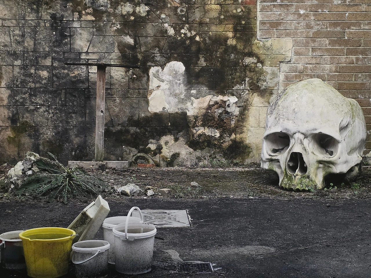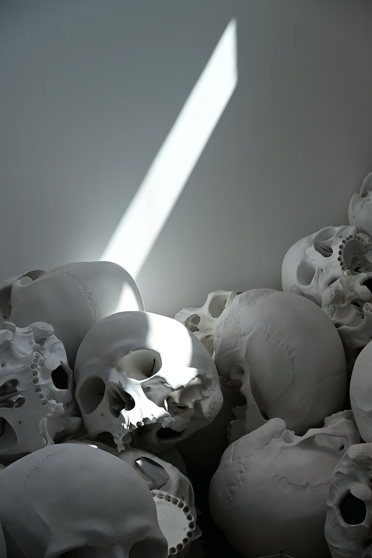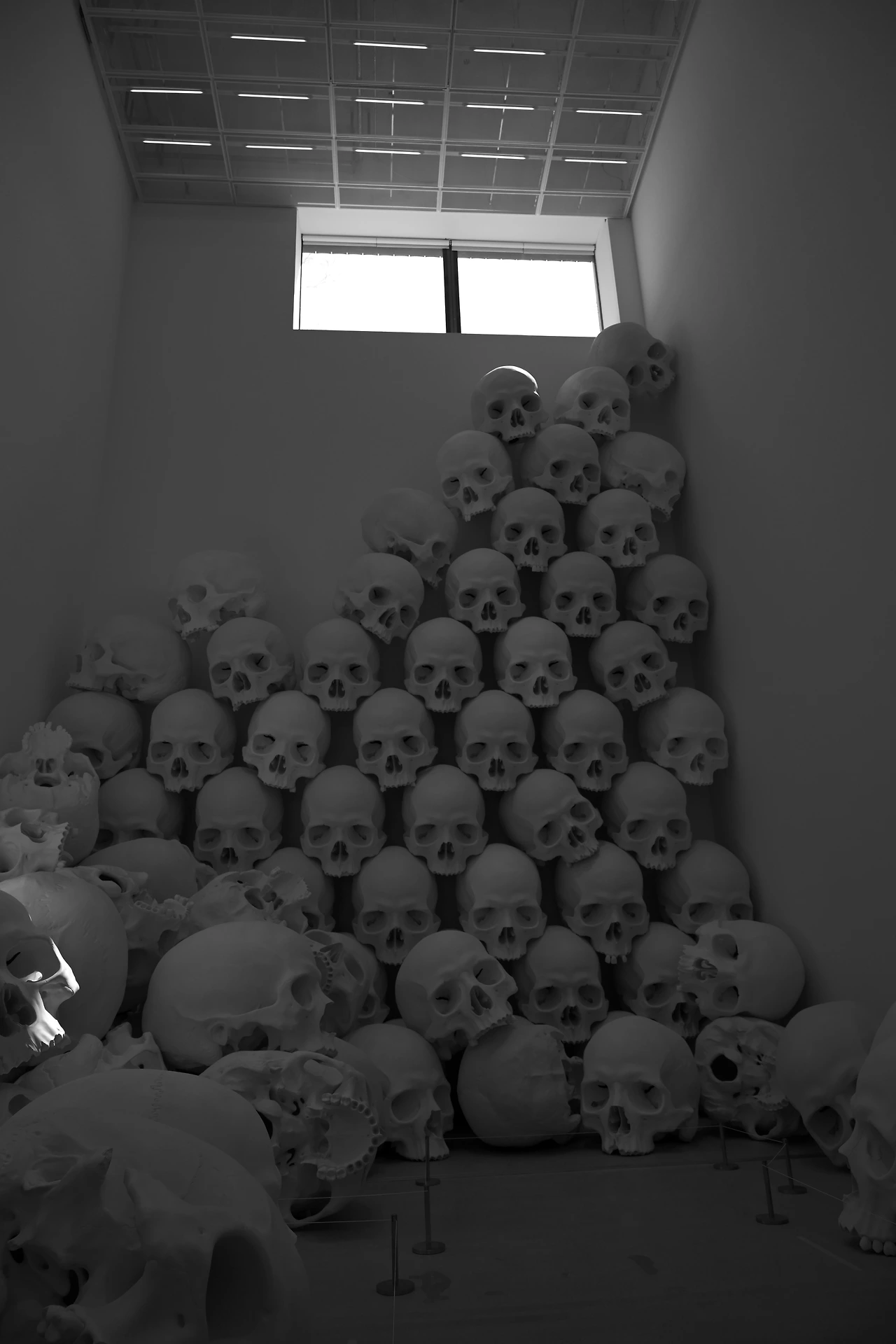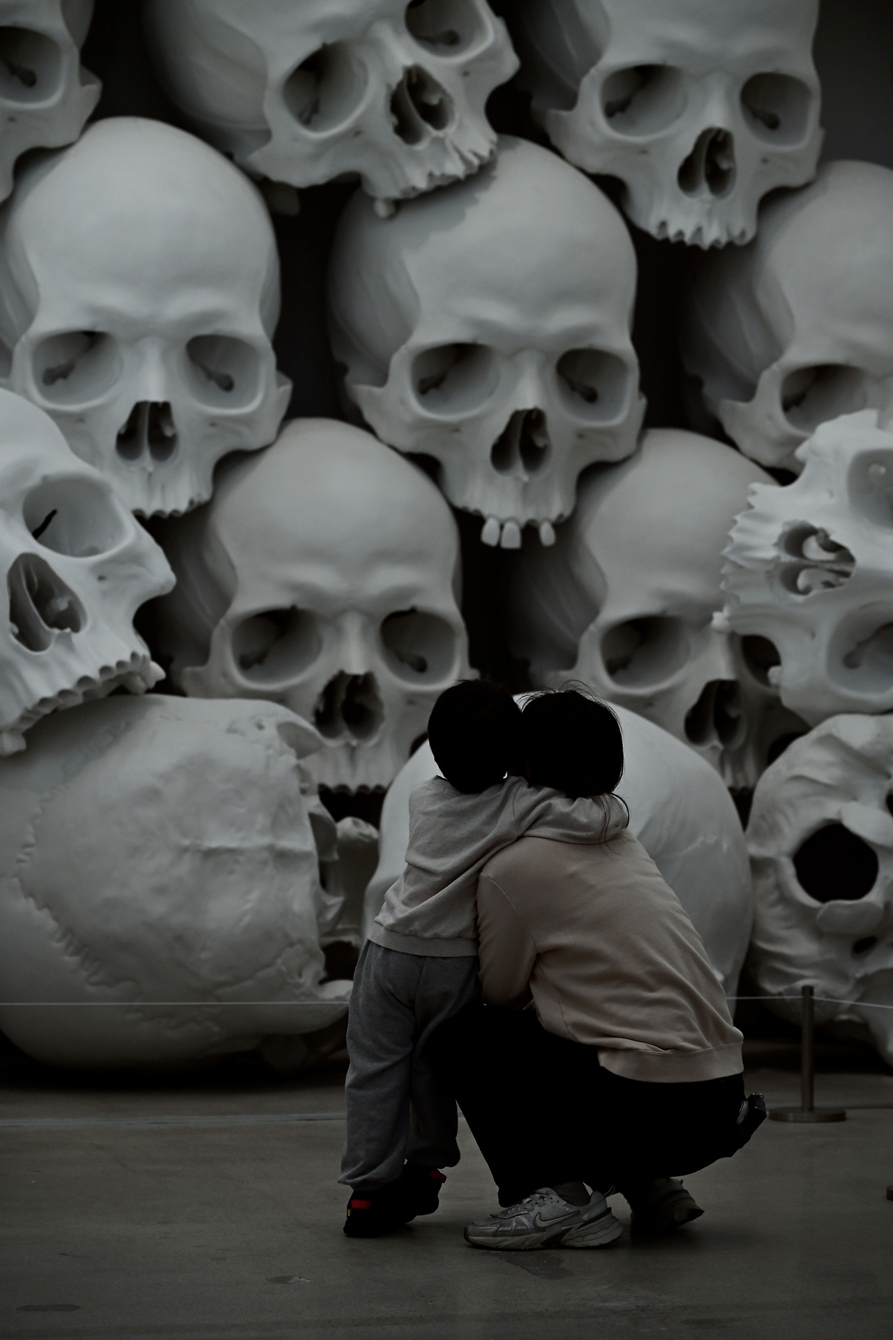 이번 전시작품들 중에서 저는 특히 매스(Mass)라는 작품에 매혹되었죠. 론 뮤익의 작품 매스(Mass)는 총 100개의 두개골 조각으로 구성되어 있으며, 각각 높이 1.2m, 무게 60kg에 달하는 대형 조각들로 이루어져 있습니다. 이 작품은 2017년 호주 멜버른의 빅토리아 국립미술관의 의뢰로 제작되었죠. 각 두개골은 동일한 크기와 형태로 제작되었는데 작가는 이러한 동질성을 통해 죽음의 보편성과 인간 존재의 덧없음을