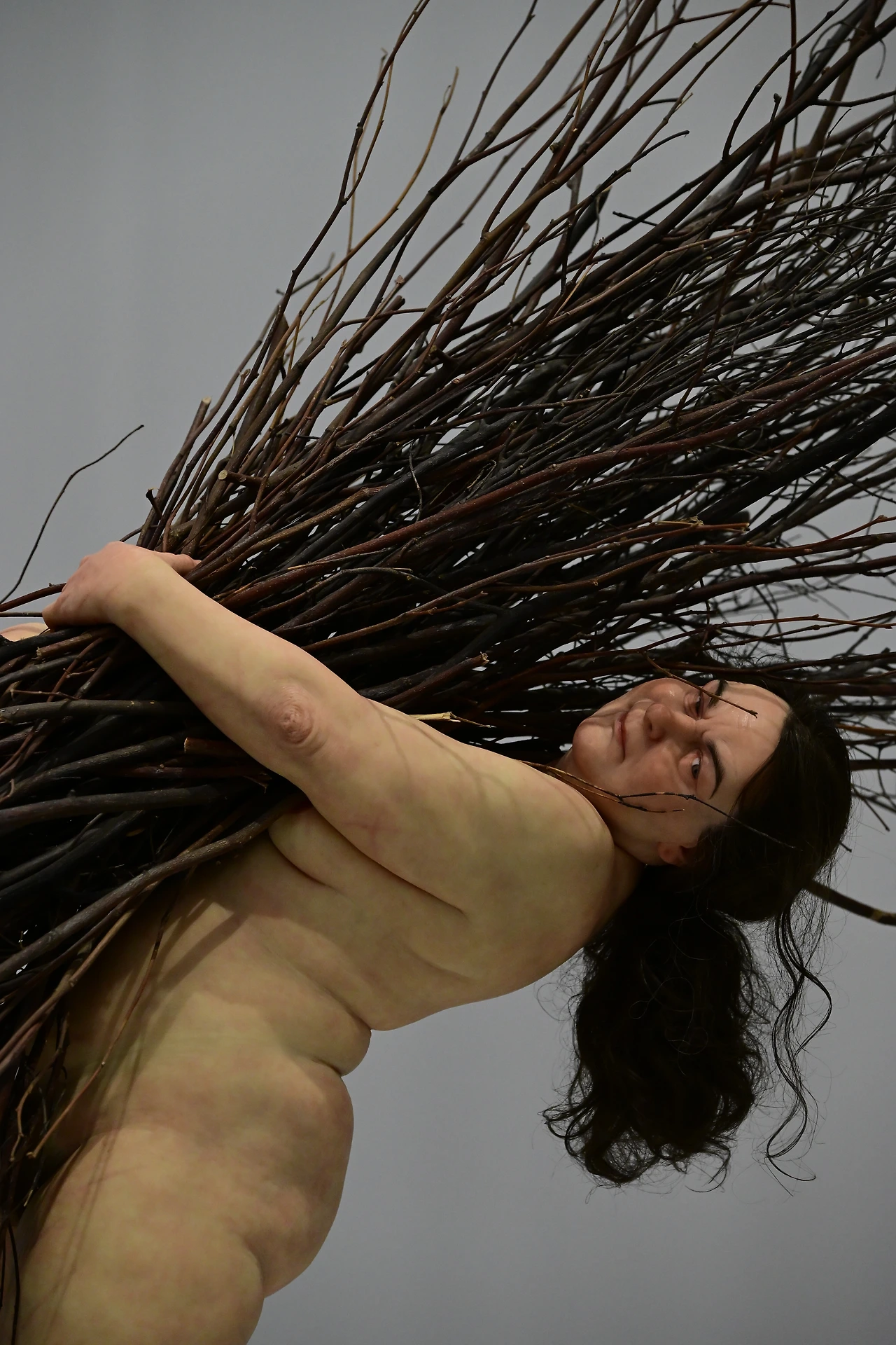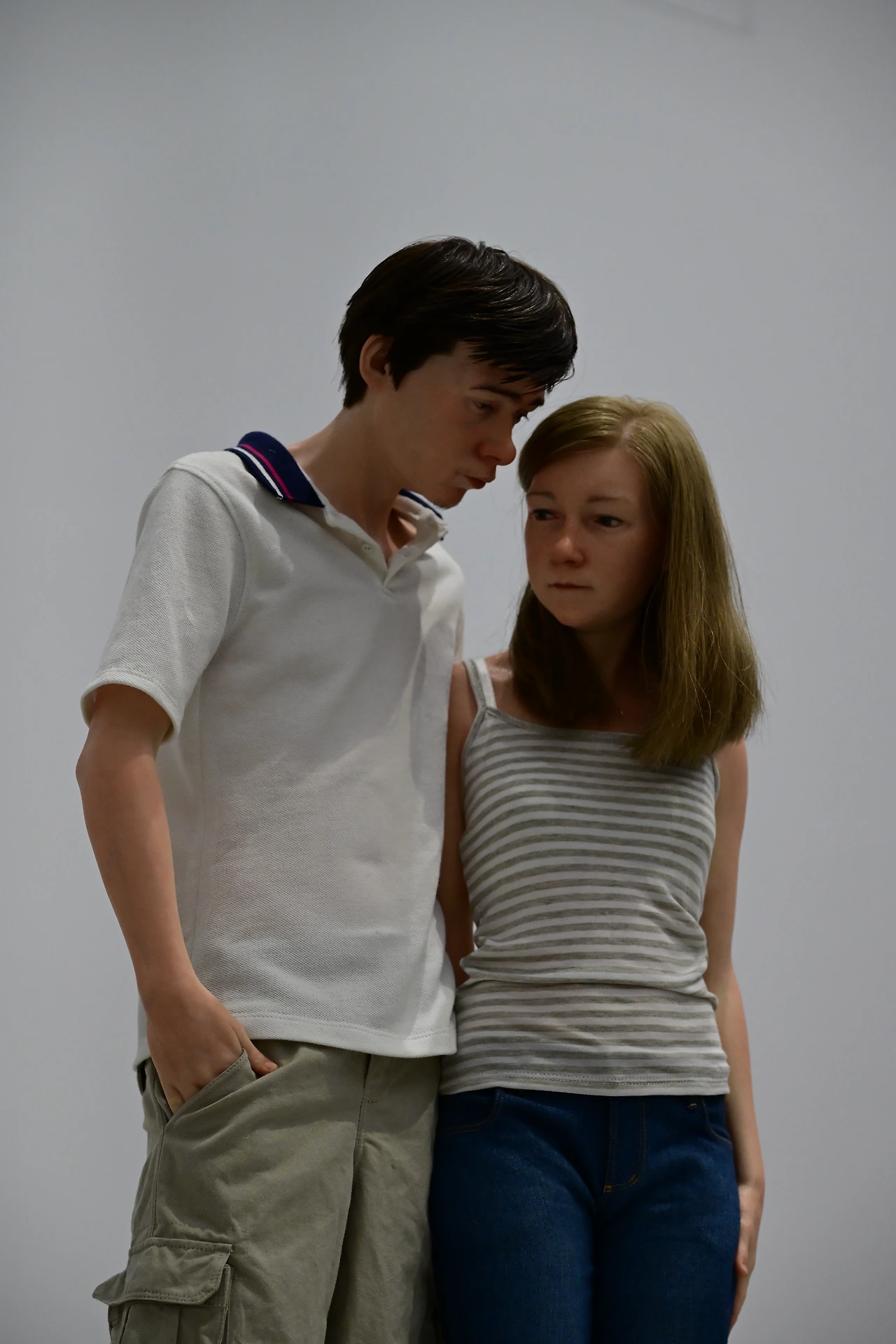 이 외에도 <나뭇가지를 든 여인>, <치킨, 맨>, <젊은 연인>, <배에 탄 남자> 등 여러 작품들이 눈길을 끕니다. 특히 다정한 속삭임을 나누고 있는 줄 알았던 젊은 연인이라는 작품은, 뒤에서 살펴보면 또 한 번의 충격을 선사하죠. 남자의 손이 그녀의 팔을 피가 통하지 않을 만큼 강하게 움켜쥐고 있어요. 마치 복화술로 그녀를 협박하고 있는 것 같은 순간이었죠. 론 뮤익 작품은 세세히 뜯어볼수록 느낌이 다 다릅니다. 같은 작품이어도 보는 각도에 따라 의미가 달라져요. 이런 다양한 변수까지 고려해 만들어 내는 그의 탐구 정신이 정말 놀라웠어요.