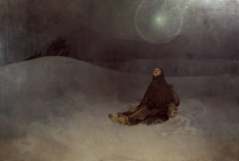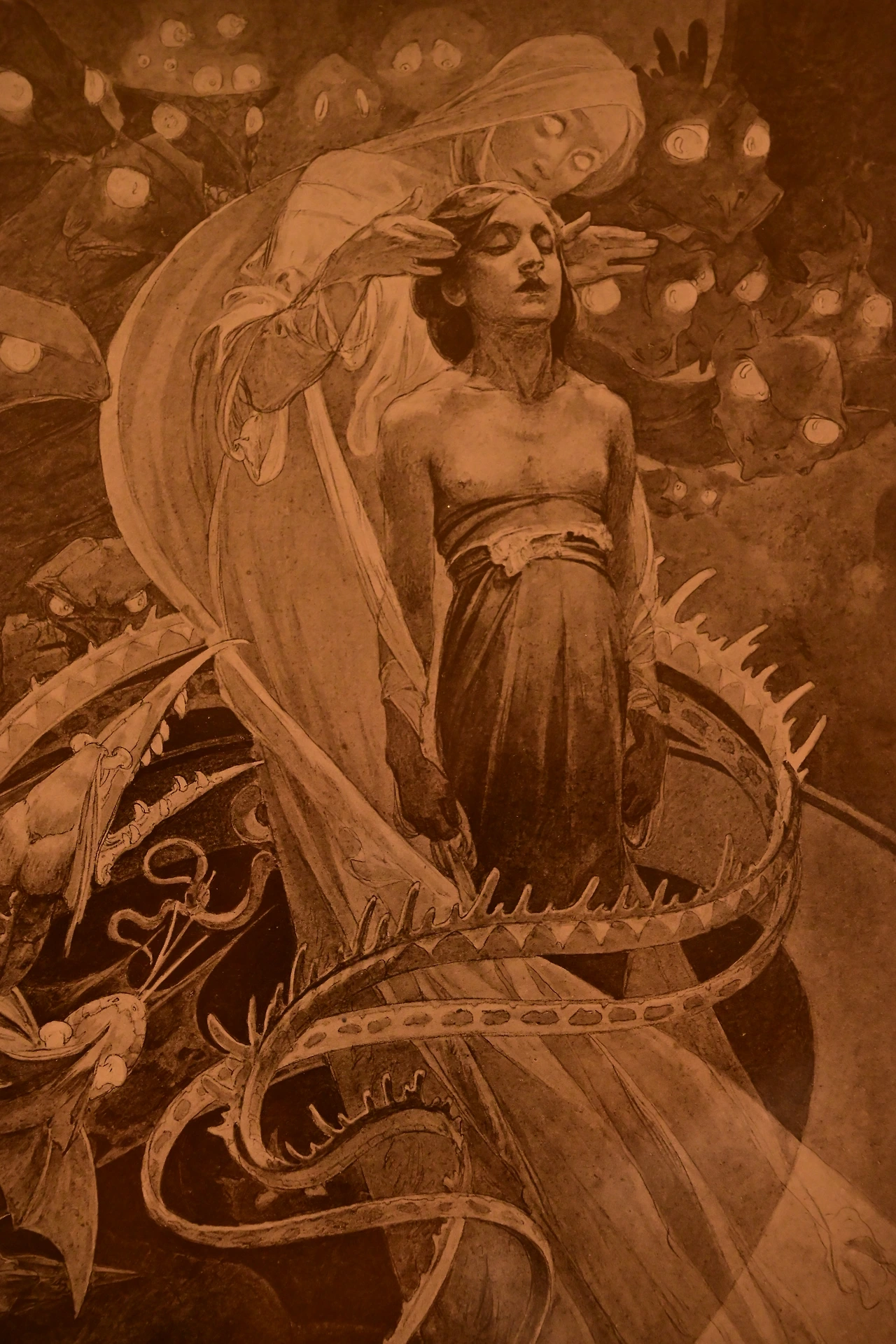 무하의 아내가 러시아 전통의상을 입고 모델이 되어 준 그림. 이 그림을 통해 무하는 1921년 러시아 대기근으로 고통받고 있던 러시아 사람들에 대한 연민과 위로를 전하고 있다. 체념한 듯 털썩 주저앉아버린 여인 뒤에 빛나는 달무리, 신의 목소리 같은 아름다운 하늘이 바로 그것이다. 그녀는 어떻게 되었을까? 뒷이야기를 그려본다. '그럼에도 불구하고'라는 접속사로 그녀의 내일을 이어가게 만드는 희망을 꿈꾸게 만든다. 알폰소 무하의 슬라브 민족 서사시 중 한 편인 <황야의 여인>. 이 그림을 통해 나는 진짜 무하를 알게 되었다.
