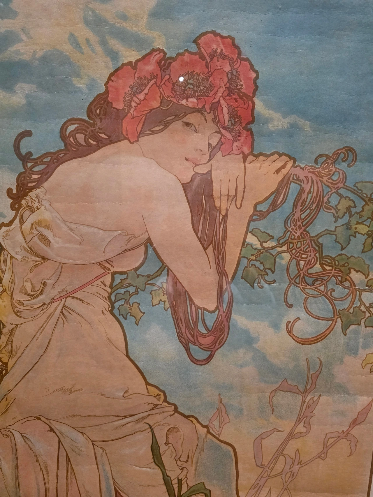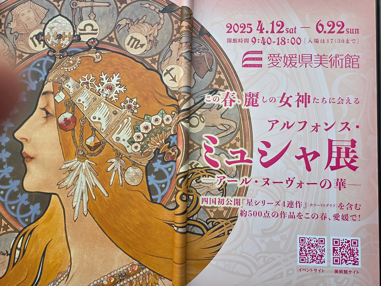 아르누보의 대가, 다양한 산업 전반에 한 획을 그은 아름다운 그의 작품이 이곳 에이메현 마쓰야마에서 전시되고 있다는 포스터를 보았다. 마쓰야마성을 방문하고 길을 따라 쭉 걷던 중 발견한 시립미술관 앞에서 만난 커다란 현수막에 마음이 두근거렸다. 서울 전시를 예약해 놓은 터라 언제 갈 수 있는지를 가늠하고 있었는데, 마치 선물처럼 내 눈앞에 펼쳐진 현수막이라니. 망설임 없이 들어가 표를 구매해 입장했다. 일본어 해설이기 때문에 번역기를 사용해 계속 확인을 해야 했지만, 다행히 유명한 원화들은 내용을 알고 있었기에 그림을 보는 것에 더 집중할 수 있는 시간이 되었다.