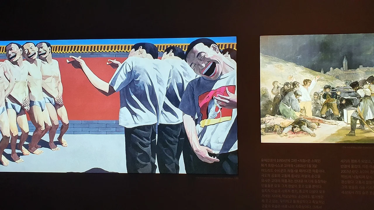 중국을 대표하는 예술가 유에민진의 작품 속에는 거짓 자아로 무장한 "스마일 증후군"상태의 인물들이 등장한다. 순응, 혹은 무기력한 상태로 웃고 있는 인물들의 표정은 "강요된 부자유와 허무"가 짙게 베어난다. 총구 앞에서 더 부각되는 인물들의 기괴한 미소가 나중에는 꼭 어떤 날의 내 모습과도 같아 눈을 뗄 수 없었다. 그런 그에게 영감을 주었다는 고야의 작품. 실제로 보면 어떤 느낌이 들까?