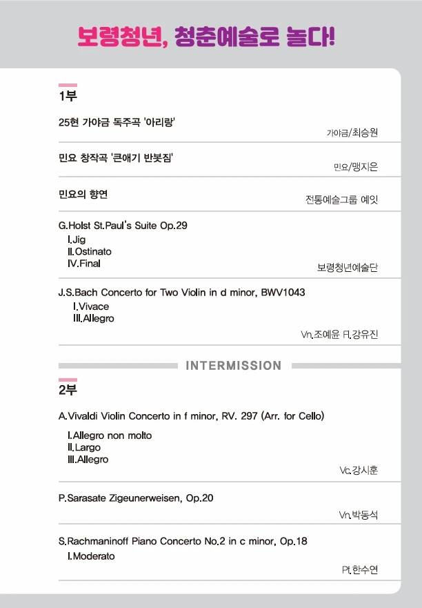 <보령 청년, 청춘 예술로 놀다> 제 4회 연주회에 사회를 맡아 다녀왔다. 젊은 청춘들의 열정 가득한 무대를 보며 지켜보는 내내 심장이 뛴다. 무엇이든 할 수 있고, 무엇이든 될 수 있는 나이의 영혼들이 부러워지는 걸 보니 나도 이제 나이를 제법 먹었는가 보다.