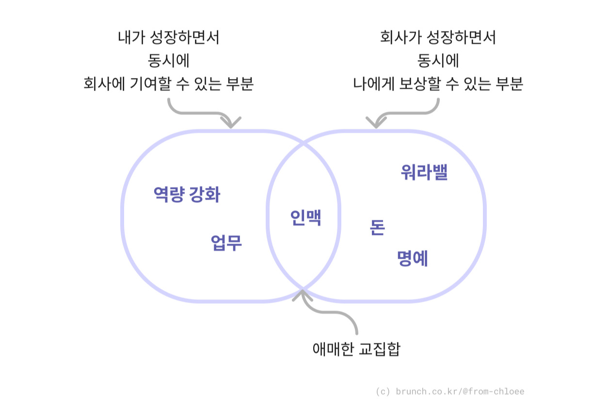 나의 성장과 회사의 성장에 초점을 맞추어 각 항목에 해당하는 특징으로 나눠보는 것이다. 여기서 인맥은 나 자신이 회사 인맥의 일부이면서 회사를 통해 인맥을 쌓을 수도 있으므로 교집합으로 분류했다.