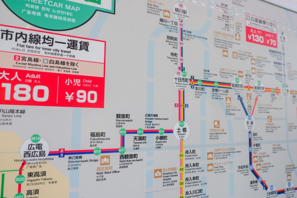 인구 117만 대도시인 히로시마의 트램인 히로덴(廣電·Hiroden)이었다. 히로덴은 히로시마와 전차(電車·Densha)의 합성어다. 히로시마 여행의 재미는 노면전차 히로덴을 타고 떠나는 여행이 아닐까 싶다. 사실 나가사키에서 노면전차 처음 봤을때 들개처럼 사진 찍었는데... 이제는 신기함이 조금 사라졌다. 가끔 그럴때 슬프기도 하다. 히로덴을 타고 미야지마까지 갈 수 있다.