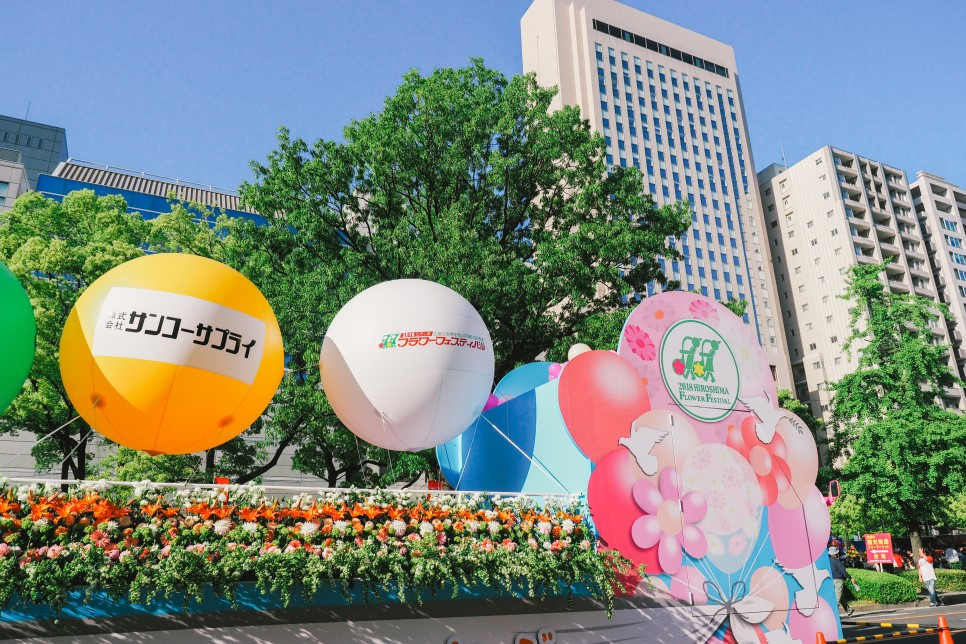 5월 내가 왜 히로시마에 있었냐면 히로시마 플라워페스티벌 부스에 참여를 하게 되었다. 히로시마에서 제일 큰 축제라는 플라워 페스티벌(フラワーフェスティバル). 매년 5월 3일~5일에 헤이와오도리를 중심으로 퍼레이드 행사를 진행한다. 플라워 페스티벌은 히로시마현이 속해 있는 주고쿠 지역에서도 가장 큰 행사라고 한다. 특히 페스티벌 퍼레이드가 있는데 많은 사람들이 참가해서 오전 11시 부터 오후 2시까지 퍼레이드가 이어진다.