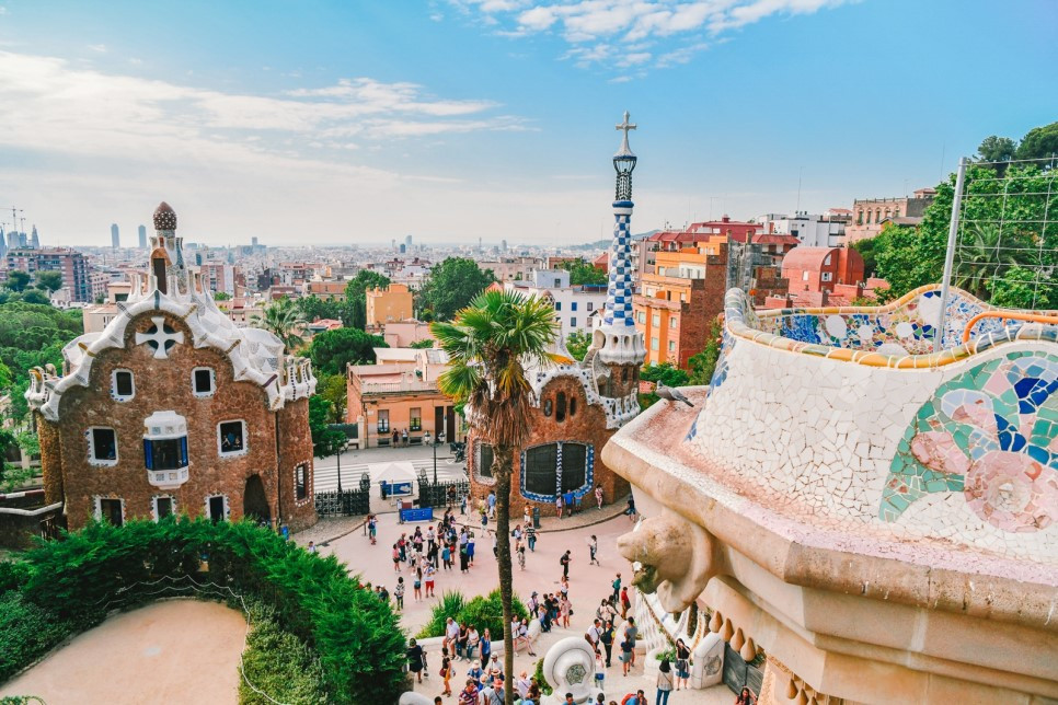 첫 코스는 구엘공원이었다. 버스투어라 버스를 타고 구엘공원까지 이동했고, 가는 동안 바르셀로나 이것저것에 대해 가이드가 너무 친절하게 설명해주셨다. 구엘공원의 건축물들은 하나하나가 개성 넘친다. 정문 앞 건물은 동화에서 소재를 얻었다고 한다. 가우디의 후원자였던 구엘 백작은 이상적인 전원도시를 만들 목적으로 바르셀로나의 펠라다 지역 땅을 매입한다. 구엘은 가우디에게 영국의 전원도시를 모델로 해서 그리스의 팔라소스 산과 같은 신전을 만들어 달라고 요청했다. 그러나 공원 부지가 돌이 많은 데다 경사진 비탈이어서 작업에 어려움이 많았다. 그럼에도 가우디는 자연스러움을 살리기 위해 땅 고르는 것도 반대했다고 한다. 그는 이 단지를 위해 무려 14년(1900~1914)이나 매진했지만 결국 자금난 등으로 미완성으로 끝났다. 1922년, 바르셀로나 시의회는 구엘 백작 소유의 이 땅을 사들여 이듬해 시영 공원으로 탈바꿈시켰다.