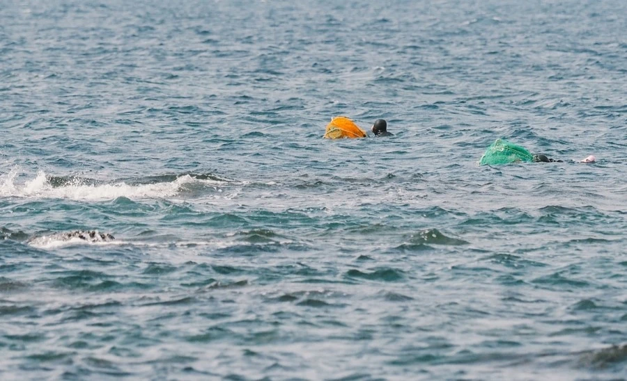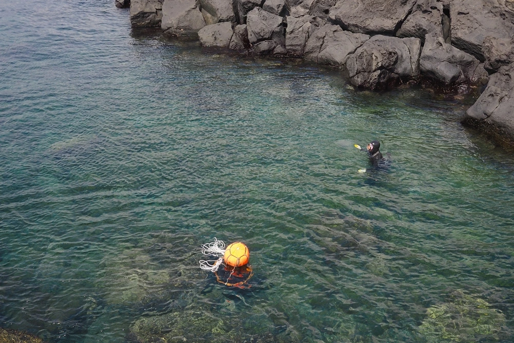 이미 뭍으로 나온 해녀분들이 아주 멀리 있는 해녀 분들을 부르기 시작했다.