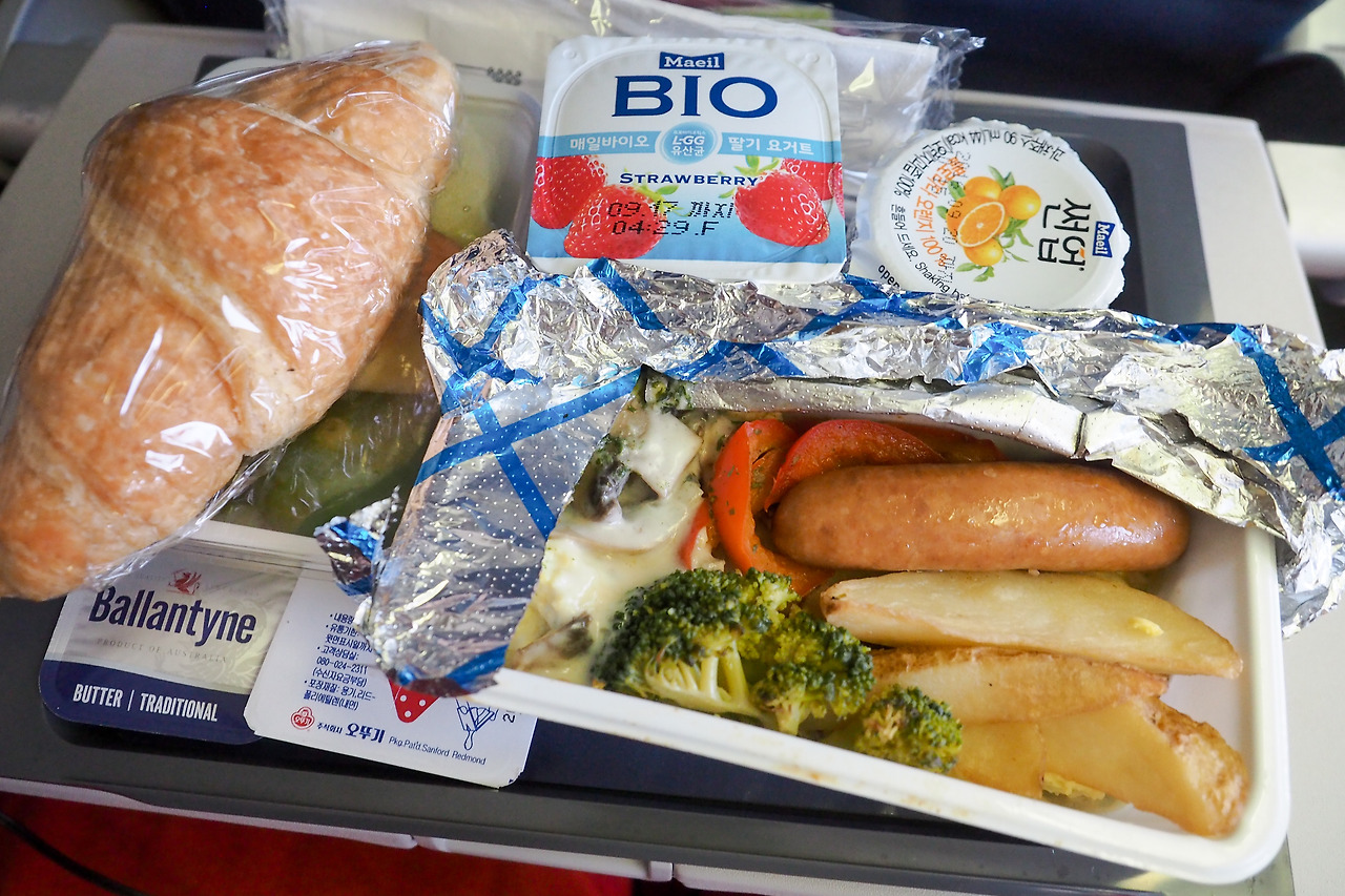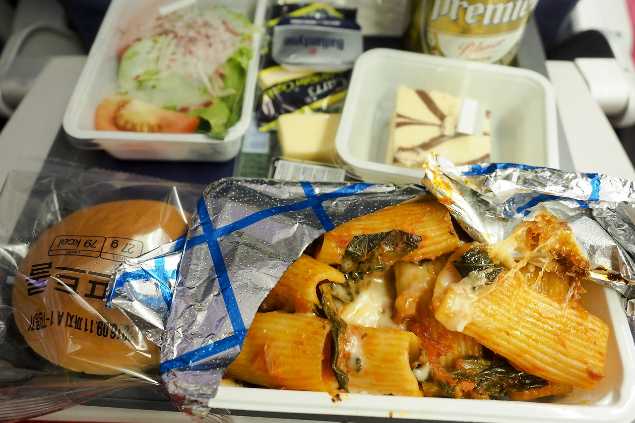 나와 내 옆에 있던 여자는 기내식 식판을 왼손에 들고 밥을 먹어야 했다.
