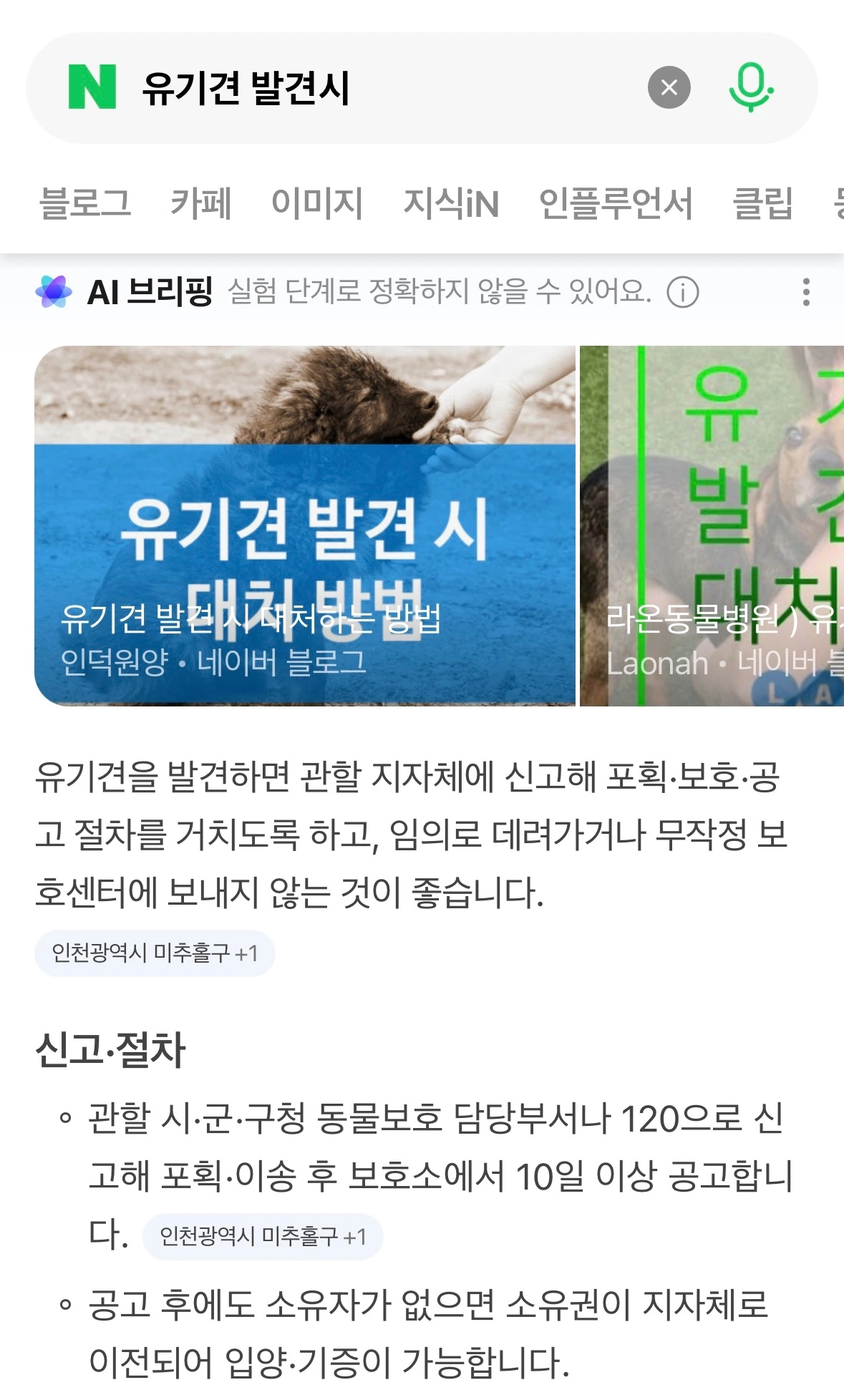 인터넷 검색창에 유기견 발견 시 대처법을 검색했다.