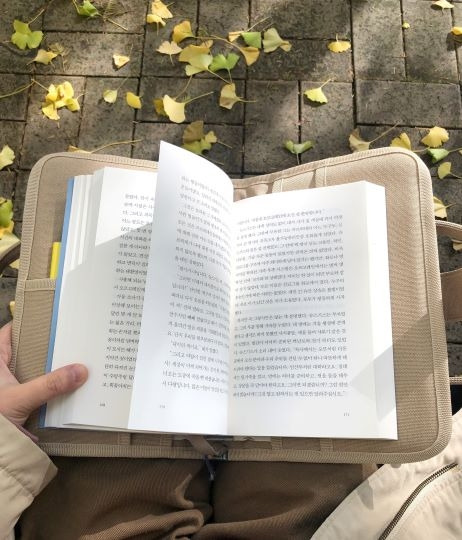 이 가방의 특히 좋은 점은, 백팩을 사용할 때인데요. 책 읽고 싶을 때마다 백팩에서 꺼내기 불편하잖아요. 그럴 때 이거 하나 더 챙겨주면, 언제 어디서나 책을 펼칠 수 있어 좋습니다.