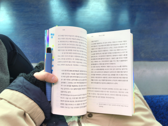 이동 중 독서의 유일한 단점은 책에 밑줄 긋기가 힘들다는 점인데요. 졸릴 때 그어 놓은 것처럼 엄청 삐뚤빼뚤 그어져서.. 그 점이 아쉬워요. 밑줄 긋다가 삑사리 날 때마다 엄청난 평형감각과 대단한 아귀 힘을 가진 사람이 되고 싶습니다..