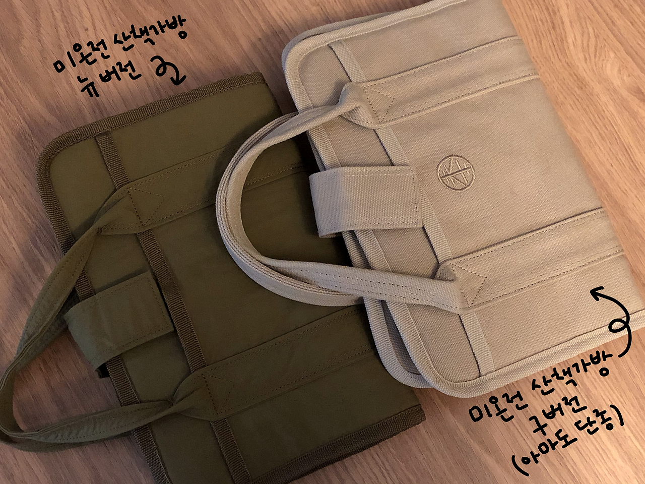 제가 너무나 애정하는 미온전의 산책가방입니다. 두 제품 모두 나름의 장점이 있는데요. 우측의 구 버전은 신 버전보다 더 빳빳해요. 뉴버전은 굉장히 흐물거리는데 덕분에 양장본을 끼우면 딱 좋습니다. 요즘에는 두꺼운 양장본은 뉴 버전의 산책가방에, 에세이나 시집처럼 얇고 잘 휘어지는 책은 구 버전의 산책가방에 들고 다닙니다.