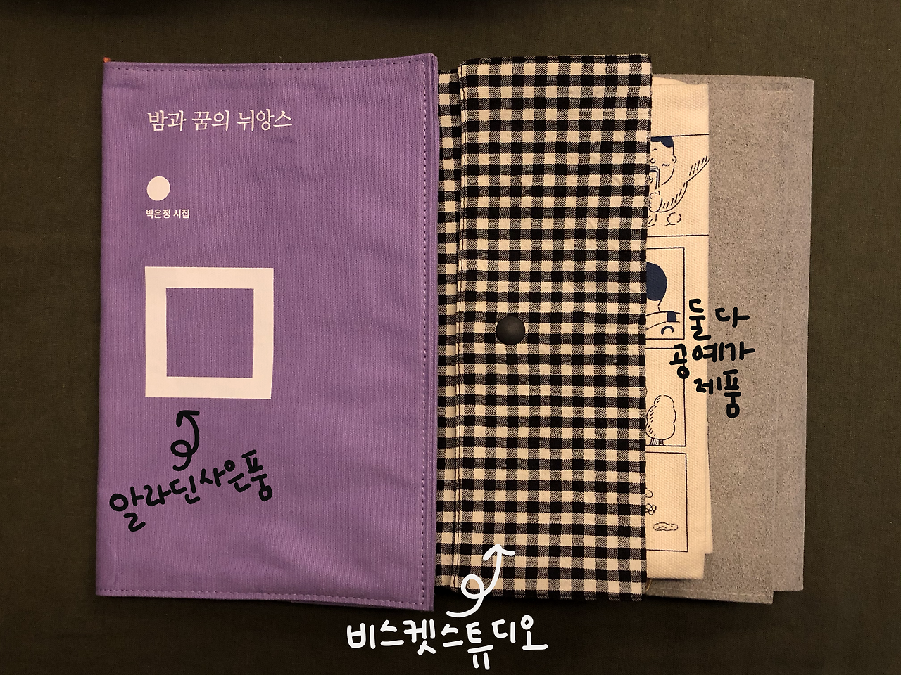 사진 속 가장 우측의 공예가 제품이 제가 사용한 첫 북커버 제품이구요. 이후에 3개가 더 생겼어요. 요즘에는 비스켓 스튜디오 제품을 자주 씁니다. 크고 두꺼운 책은 안 들어가니 유의하세요! 알라딘 사은품은 너무 빳빳해서 잘 쓰진 않구요. 공예가 제품은 책을 잘 잡아주고, 가름끈도 달려 있어서 편해요.
