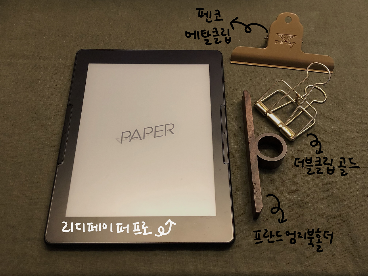 더블클립 골드와 펜코 메탈클립은 책을 고정시킬 때 주로 사용합니다. 두 제품 모두 종이를 힘있게 잡아주기 때문에 필사나 메모가 하고 싶을 때 책이 넘어가는 것을 방지해줘요. 더블클립의 경우에는 제가 정말 좋아하는 디자이너분께서 사용하시는 것을 보고 따라 샀는데요. 넘 잘 따라한 것 같아요.. 디자이너분께 감사의 인사를 전합니다..