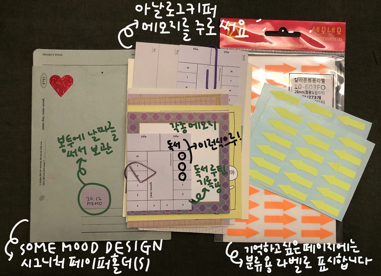 메모는 책에 직접하는 경우도 있고, 메모지에 써서 마스킹테이프로 붙여놓는 경우도 있습니다. 메모지는 주로 아날로그키퍼 제품을 쓰는데요, 종이가 매끄럽지만 펜이 미끄러지진 않을 정도여서 좋고, 또 번짐이 적습니다. 얼마 전에 인스타에 올린 메모 사진을 보고 친구가 보관은 어떻게 하느냐고 물어봤었는데, 책과 관련된 내용은 주로 책에 끼워두고요. 갑자기 떠오른 생각을 적은 메모지들은 위 사진의 좌측, 페이퍼홀더에 끼워서 보관합니다. 날짜를 써서 보관하면 찾기가 쉬워요. 가격도 홀더 하나당 2,000원이어서, 한 달에 하나씩 쓴다고 하면 큰 부담 안되는 것 같아요.