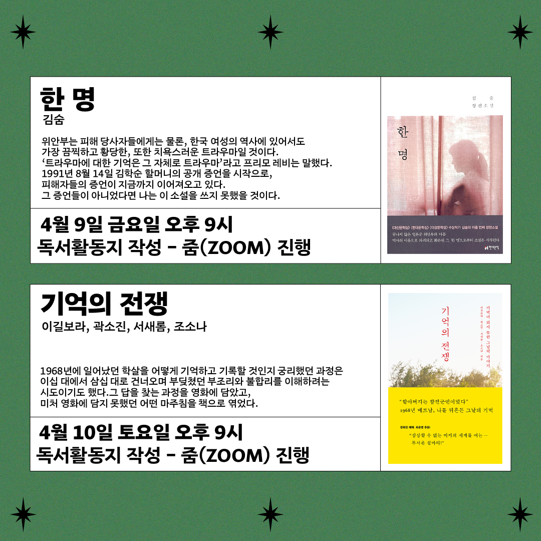 그리고 나는 이 부조리한 자격의 문제에 대해 이 책 부록에 실린 정희진(여성학 연구자, 문학박사)의 글, '영화 <기억의 전쟁>이 촉발한 사회운동의 윤리 : 한국 사회의 '저항'과 '양심' 담론을 생각한다'가 모임의 토론을 이끌어가는 데 주요한 역할을 할 것이라 기대했고, 이 글을 통해 모임 내 논의가 여러 갈래로 확장되길 희망했다.