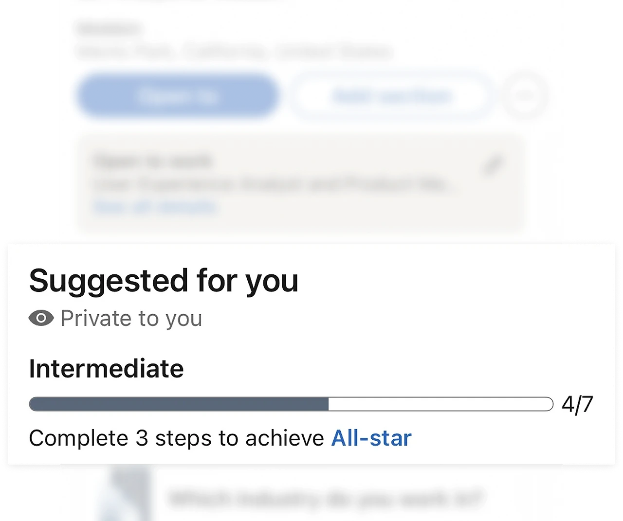 LinkedIn 프로필에는 ‘완성도를 높이기 위한 추천 항목’이 함께 나타난다.