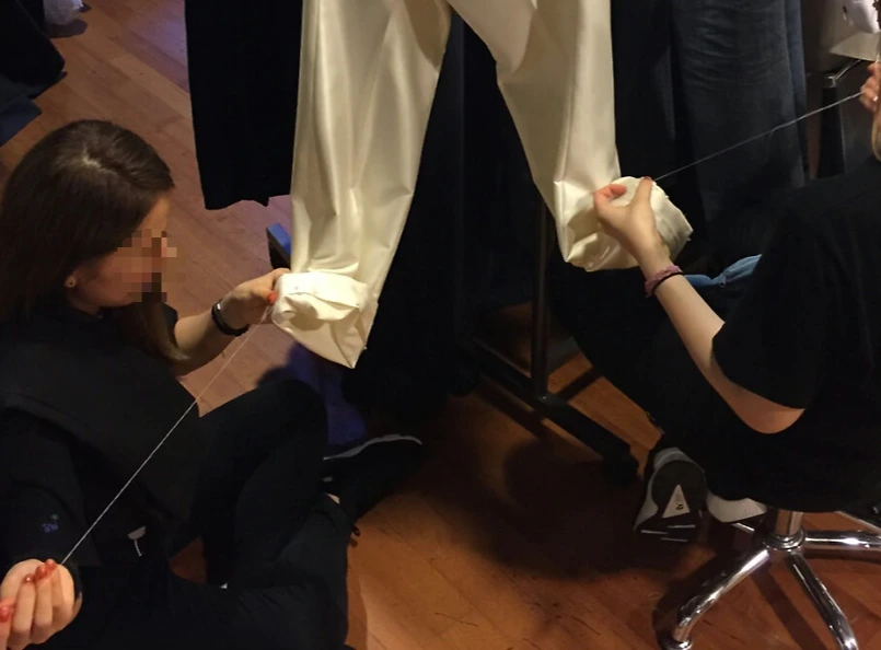 긴 밑단이 쭈글거리는 바지를 입히는 건 두고 볼 수 없었던 나와 동료 언니는 바닥에 주저앉아 바지 다리 한쪽씩을 붙잡고 쪽가위로 뜯은 뒤에 손바느질을 하기 시작했다. 맞춰야 하는 기장은 눈에 띄는 색깔의 실로 아주 작게 표시를 해 놓았기 때문에 바로 찾을 수 있다.