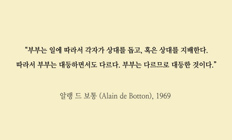 그냥 묻지도 따지지도 말고, 기차선로처럼 서로의 규칙을 지키며 살아가라고 이야기하고 있습니다. 아무리 힘들고 지치고 시간이 없더라도 결혼을 통해 우리가 결정한 폭의 육아나 일들을 해나가야 합니다. 우리는 한쪽으로 치우치거나 혹은 서로에게 육아를 미루고 있는 건 아닌지? 서로 살펴볼 필요가 있을 것 같습니다. 서로 협력적인 부부가 된다면 기차는 탈선하지 않고 옳은 방향으로 갈 것이기 때문입니다.