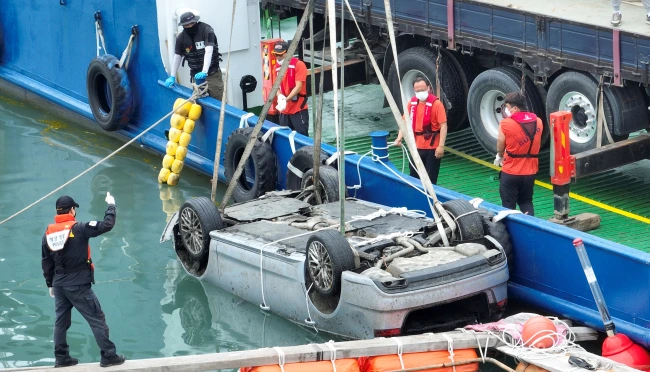 지난 6월29일 전남 완도군 신지면 송곡선착장 인근 방파제에서 경찰이 10m 바닷속에 잠겨있는 조유나(10)양 가족의 차량인양 모습