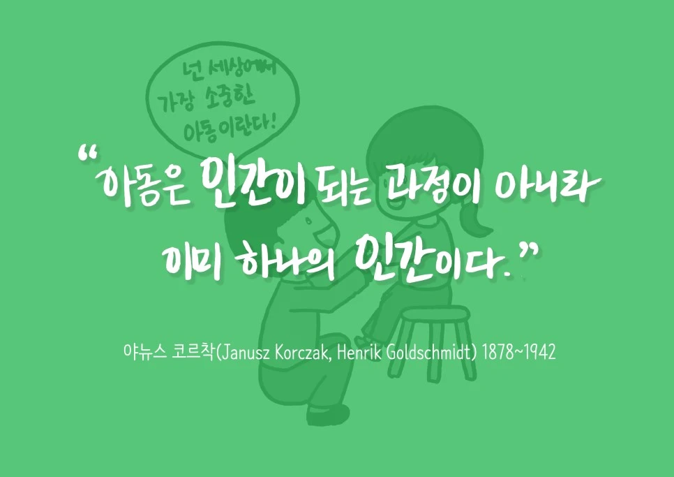 최근 우리 사회복지사들은 현장에서 당사자들의 권리를 기반으로 접근을 하고 있습니다. 특히 아동과 관련된 일을 하는 저는 ‘아동권리기반’을 원칙으로 삼고 있습니다. 아이들이 물을 달라고 할 때에도 예쁜 찻잔에 담아주거나 우리와 같은 구성원으로 여기고, 의사결정에 아동을 참여시킵니다. 역사적 개념의 아동은 ‘약함’ ‘귀여움’ ‘모자람’ ‘무지’이지만 이제 새로운 ‘주체적’ ‘자율적’ ‘권리적’으로 변하고 있습니다. UN에서는 전 세계 아동들의 권리를 보호하기 위해 1989년에 UN아동권리협약을 만듭니다. 이 협약의 사상적 근거가 된 야누슈 코르착(본명/헨릭골드쉬미트)은 1942년 2차 세계대전 당시 200여 명의 고아들과 함께 가스실에서 죽음을 맞이하는 유대계 폴란드인으로 아동의 자발성과 주도권을 통해 조화롭게 운영되는 공동체를 실현하고자 한 의사이며 아동문학가이자 교육철학가였습니다. 그는 인류가 하지 못한 아동에 대한 새로운 개념을 100년 앞서 몸소 실천하고, 아동의 권익을 위해 끝까지 맞서 싸운 인물입니다. 제가 현장에서 아동을 만날 때 늘 생각하는 소중한 분이죠. 이 협약에는 아동이면 누구나 누려야 할 생존, 보호, 발달, 참여의 권리가 담겨있고, 18세 미만 아동의 모든 권리를 담은 국제적인 약속으로 1989년 11월 20일 유엔에서 만장일치로 채택됐습니다. 우리나라를 포함 전 세계 196개국이 지키기로 약속했죠.