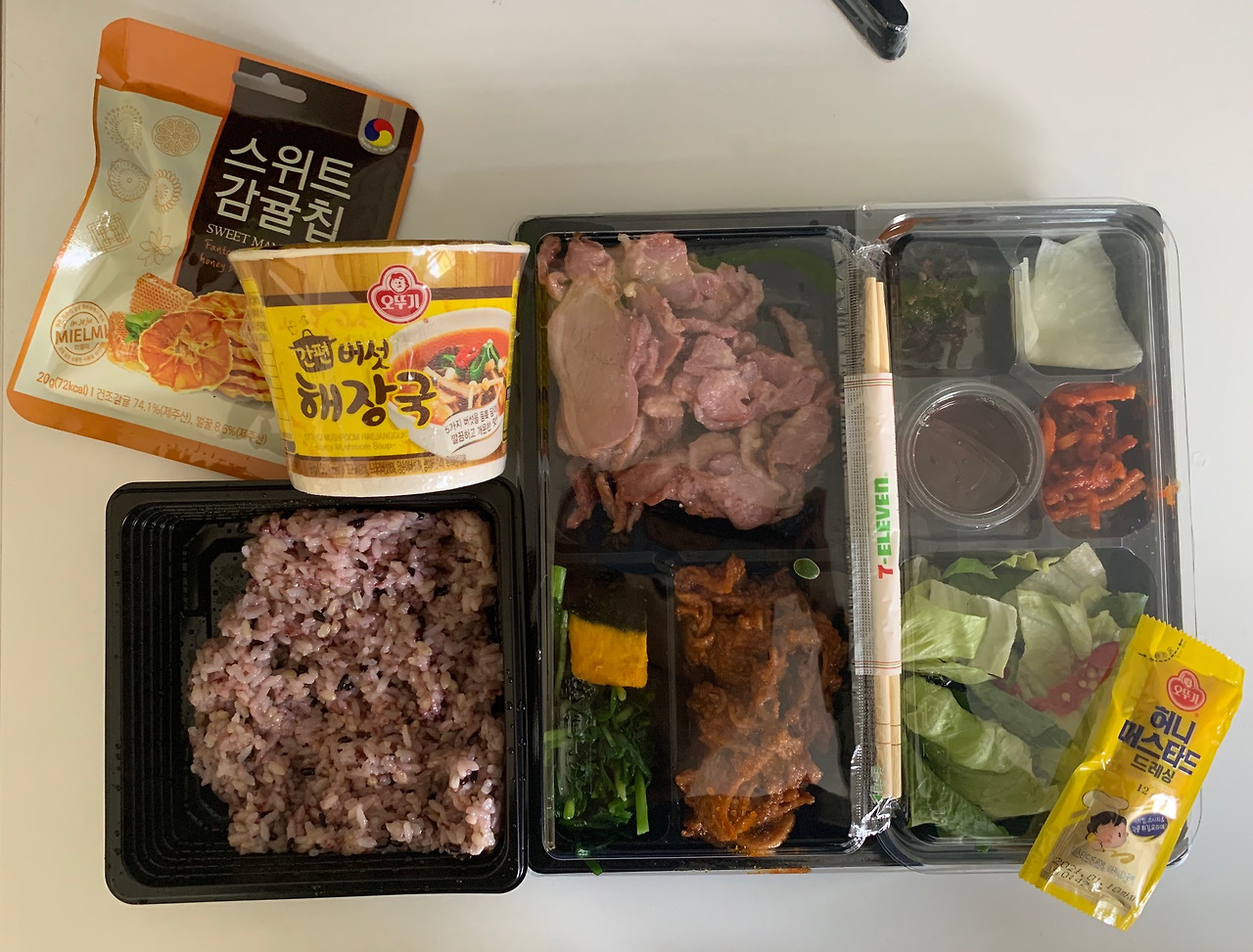 환자들을 위해 식사를 따로 만든다는 느낌이 들만큼 매 끼니에 대부분 샐러드가 있다. 한 평 정도 되는 작은 방 안에서 바깥 활동을 하지 못한 채 지내야 하니 생리적인 불편함이 없도록 대장 활성화를 위해 푸른 야채가 빠지지 않는다. 그리고 매 끼니에 대부분 고기가 포함되어 있다. 오리고기, 제육볶음, 불고기, 돈가스, 스테이크 등의 반찬을 만날 수 있다. 그리고 매 끼니에 국이 같이 배달된다. 대부분 편의점 간편식들로 매 끼니마다 다른 종류의 국이 함께 온다. 밥은 도시락과 별개로 따로 제공된다. 네모진 박스 안에 쫄깃한 밥이 한가득이다. 맛은 몰라도 씹는 식감을 통해서 밥이 참 찰지다고 생각했다. 식사가 배송될 때 한번 데워져서 오는지 밥에 따뜻한 기운이 그나마 조금 남아있다.