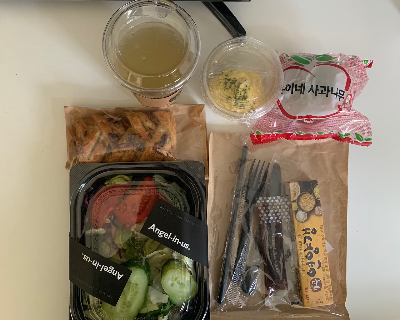 오늘 아침에도 엔제리너스에서 빵과 샐러드가 배달되었다. 오늘 함께 배달된 음료를 마시고 나의 미각이 어느 정도 회복되었음을 알 수 있었다. 오늘의 음료는 레모네이드 아니면 유자에이드 같았다. 굉장히 프레시 하다고 느꼈지만 미세한 감각이 살아나지 않아 아직도 음료의 정확한 정체는 모르겠다. 어제부터 샤워를 하고 난 후에 샴푸 냄새도 언뜻 맡아지는 걸 봐서는 후각 또한 어느 정도 회복되는 중이다. 내가 이 곳에서 쓰는 바디샤워 향이 망고향이었다는 것도 어제서야 알게 되었으니 말이다.