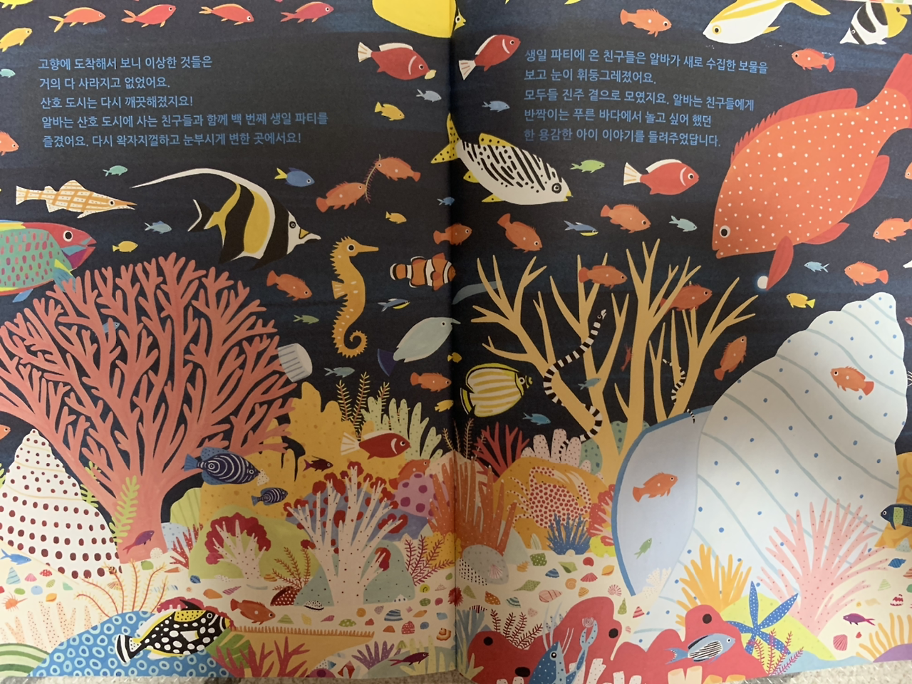 "OO아~ 그게 무슨 말이야? 알바천국이라니? 도대체 그런 말은 어디서 들은 거야?"라고 반색하며 묻는 나에게 다섯 살 아들은 엄마의 질문이 더 황당하다는 표정을 지으며 내게 말했다. "엄마, 엄마야말로 무슨 말이야? 여기 봐봐, 여기! 완전히 알바 천국이잖아!!!"라며 손가락으로 뭔가를 가리킨다. 녀석의 손가락을 가만히 따라간 나는 그제야 '아뿔싸' 싶었다. 그곳에는 아들과 함께 읽고 있던 책의 마지막 페이지가 펼쳐져 있었고, 그 책의 주인공인 물고기 '알바'의 그림이 페이지 가득 그려져 있었다. 아들은 책의 마지막 페이지를 넘기는 순간 그 장면을 봤고 그 순간 주인공 '알바 물고기'가 가득한 장면을 보고는 '알바 천국'이라고 표현하며 스스로 감탄사를 내뱉은 것이었다. 그런데 나는 누구나 '알바 천국'이라는 단어를 들으면 떠올릴 법한 CF를 떠올렸고 이미 세상에 가득 물들어버린 아주머니 한 명은 그 단어가 아들의 입에서 나왔다는 것에 꽤나 불쾌해했다. 나는 녀석에게 빠르게 사과했다. "어머, 그렇네! OO이가 이 그림을 이렇게 멋진 문장으로 표현했는데 엄마가 못 알아들어서 너무 미안해!"