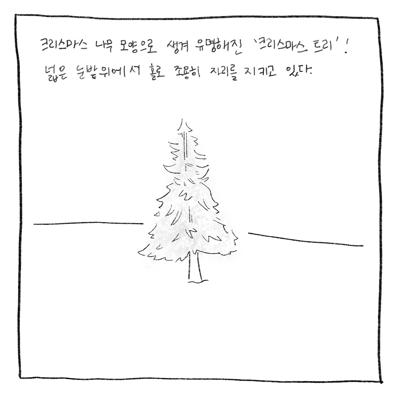 밥을 든든히 먹고 다시 시작된 비에이 투어. 비에이 투어 코스의 가장 하이라이트는 바로 크리스마스트리다. 사람들이 비에이 하면 가장 많이 떠올리는 풍경이기도 한 대표적 장소다. 넓은 설원에 홀로 조용히 서 있는 나무. 생김새가 크리스마스트리와 비슷하다 하여 그렇게 불리고 있다.