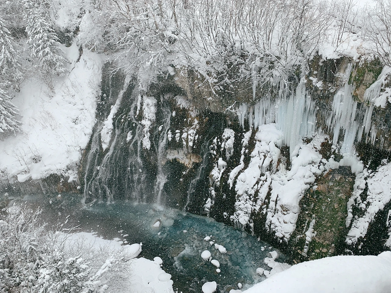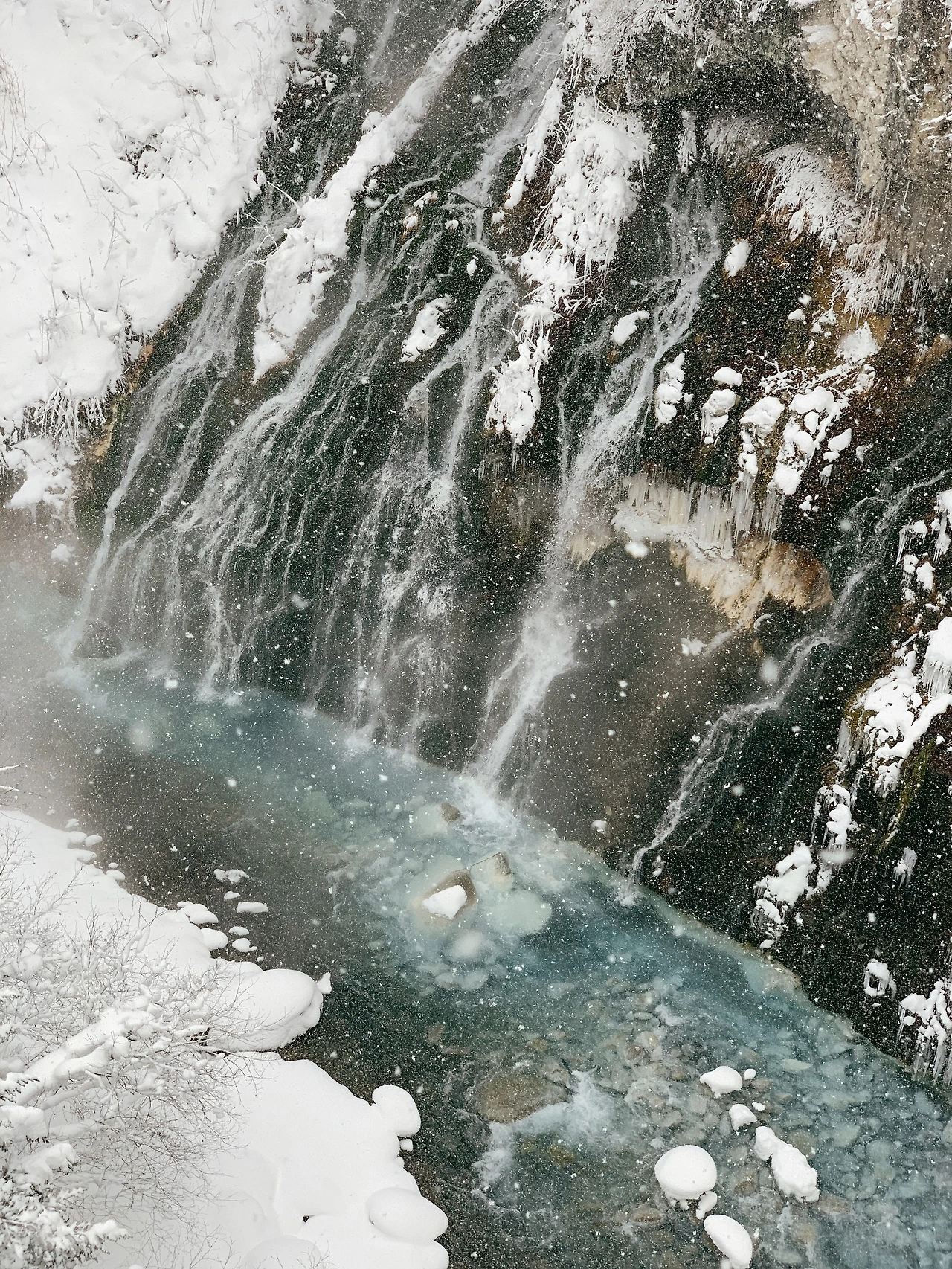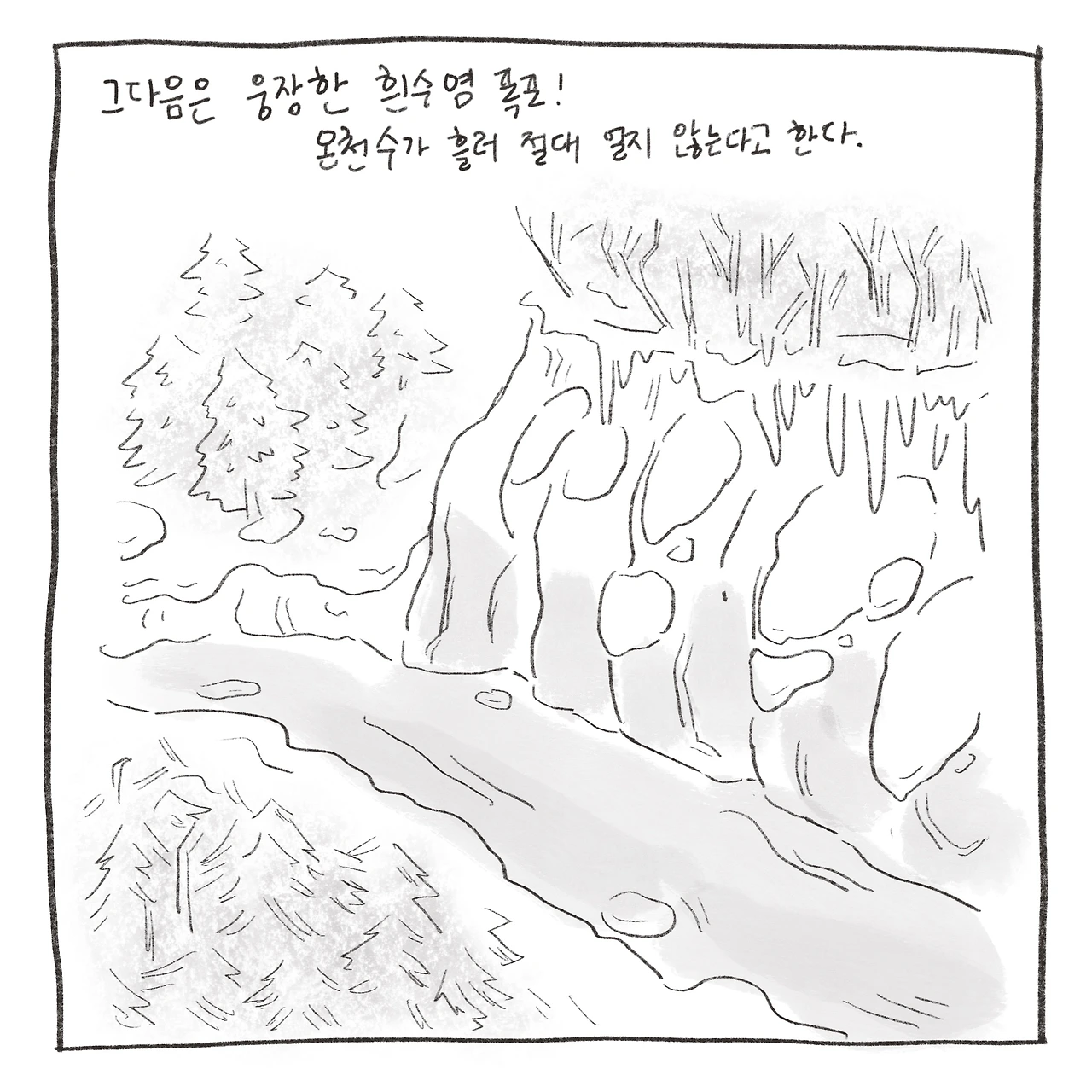 다음 장소는 웅장한 흰 수염 폭포. 온천수가 흘러 아무리 추워도 절대 얼지 않는다고 한다. 온통 눈과 얼음이 잔뜩 쌓인 곳에서 김이 펄펄 나는 거대한 폭포를 본다는 건 정말 색다른 경험이다. 폭포 소리가 너무 커 아까와는 정반대로 목소리를 높여 소리치며 대화해야 했다. 난간에서 뜨거운 연기를 뿜어내는 폭포를 내려다보는데 이건... 생각보다... 꽤 무섭다. 나는 고소공포증이 꽤 심한 편이라, 초등학교 때는 정글짐 꼭대기도 못 올라갈 정도였다. 그런 내가 위에서 거대한 폭포를 내려다보니 꼭 떨어질 것 같은 기분이 드는 것이다. 그런 와중에 사진 열정을 뽐내시는 가이드님. 당시 최신형으로 바꿔 화질이 굉장히 좋았던 내 핸드폰 카메라에 감탄하며 열정적으로 사진을 찍어주신다.