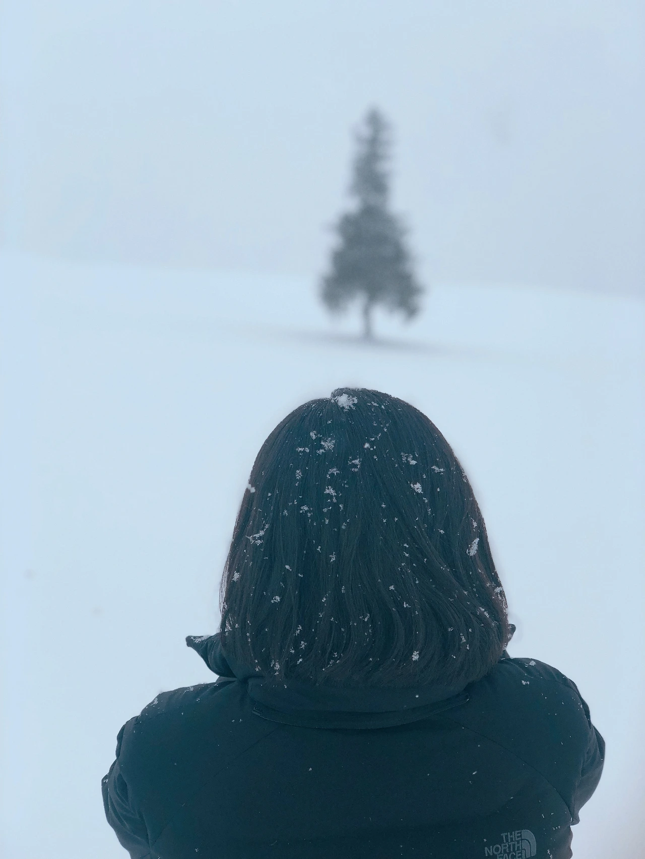 제대로 떠지지 않는 눈을 비비며 차에서 내리자 완벽한 고요가 온몸을 감쌌다. 주변에 다른 투어버스가 하나도 없어서 그런지 그 어느 때 보다도 조용한 분위기에, 휘날리는 함박눈은 말이 없다. 크리스마스트리가 있는 곳은 사유지이기 때문에 들어갈 수가 없어 바깥에서만 열심히 풍경을 눈에 담았다. 어느새 자연스럽게 목소리를 낮춰 소곤소곤 이야기하는 나를 발견했다. 그만큼 흰 설원과 홀로 자리를 지키고 서 있는 크리스마스트리의 존재감은 대단했다.