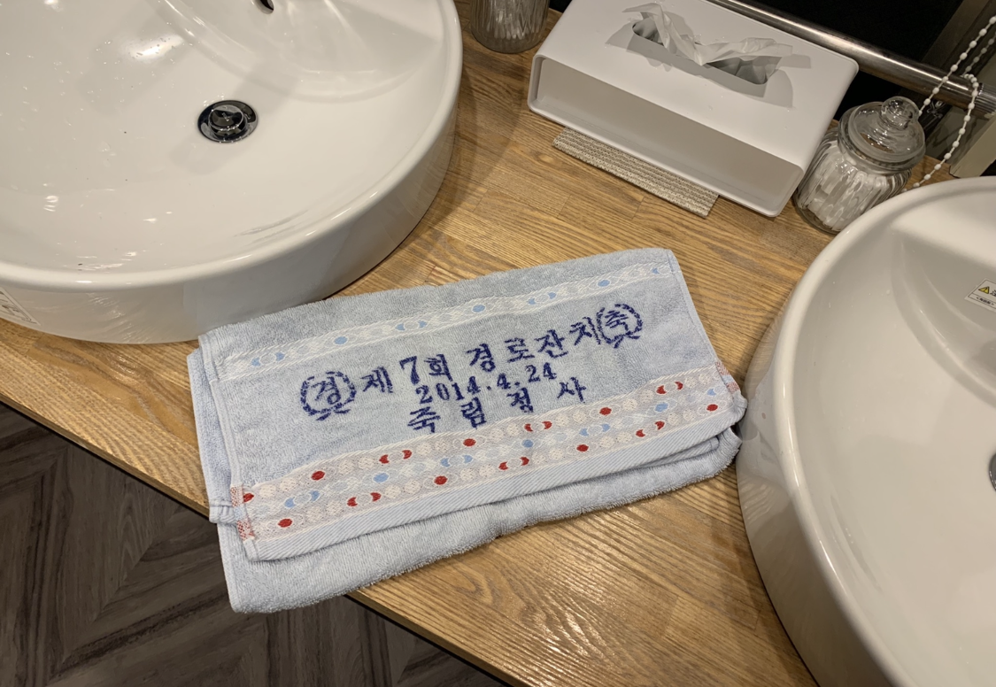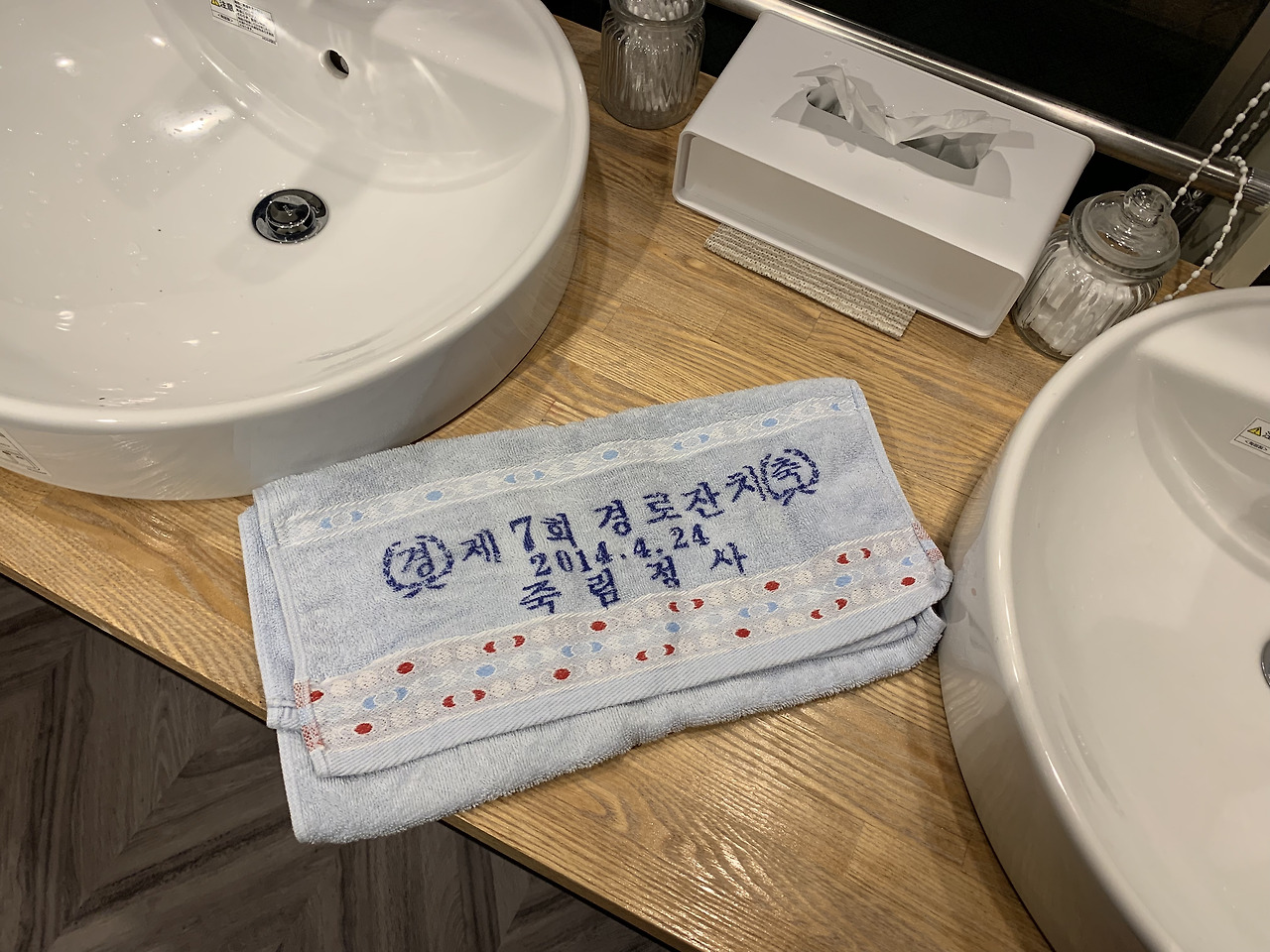 기분 좋은 삿포로의 첫날밤! 편한 옷으로 갈아입고 눈에 푹 절여진 몸을 씻기 위해 세면대에서 세수를 하는데 음..? 여기에 경로잔치 수건이..? 여기가 삿포로인지 한국 찜질방인지 잠시 혼란이 왔다. 도대체 저 수건은 어디서 흘러들어와 삿포로 신설 호스텔 세면대에 물기 제거용으로 놓여 있는 걸까?