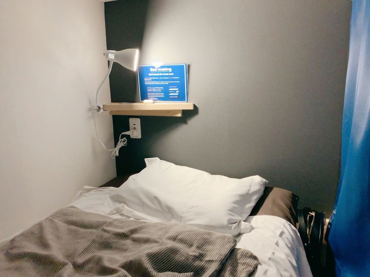 나는 집에서도 잘 때 무드등을 꼭 켜고 자는 사람인데, 그 탓에 외국여행을 가 혼자 자는 것은 내게 더욱 생소하고 무섭게 느껴진다. 그래서 혼자 여행을 갈 때는 늘 호스텔을 이용하곤 하는데, 이곳은 새로 생긴 호스텔답게 굉장히 깔끔하고 시설이 좋았다. 카운터 직원분도 일본인이지만 영어를 매우 잘하셨고, 가보진 않았지만 지하에는 분위기 좋은 미니펍까지! 유럽에서 하루에 7유로짜리 호스텔에서도 잘 잤던 나에게 이 정도면 아주 최신식 호스텔이다. 내 방은 8인실 여성전용 방이었는데, 이층 침대 각자 자리마다 두꺼운 커튼이 쳐져 있어 사생활 보호가 되어 좋았다. 특히 가장 좋았던 것은 바로 화장실. 굉장히 넓고 샤워실도 잘 분리가 되어 있어 더욱 깔끔하고 아주 만족스러웠다. 슬프지만 우리 집 화장실보다 50배는 좋은 느낌이다.