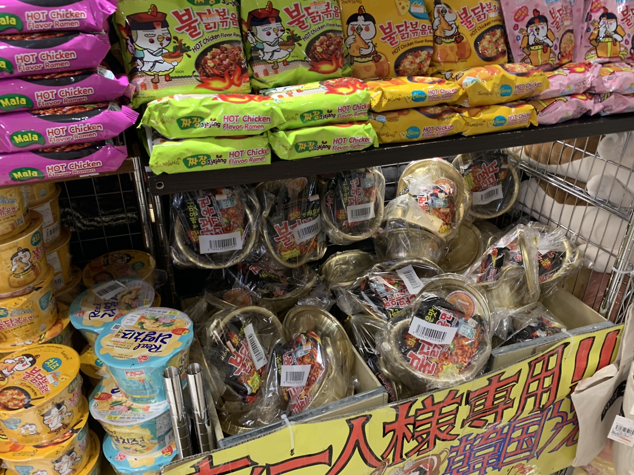 다이마루 백화점에서도 가장 먼저 푸드코너를 둘러보는데 멀리서부터 보이는 익숙한 빨간 색깔.. 설마 내가 아는 그 라면? 그 유명한 불닭볶음면이 엄청나게 많이 입구부터 쌓여있었다. 심지어 양은냄비와 세트상품으로! 정작 한국인인 나는 양은냄비를 한 번도 써본 적이 없는데 말이다. 물론 그 옆에는 까르보 불닭볶음면도 있었으며, 한국에서 볼 수 없는 마라 불닭볶음면까지 있었다.