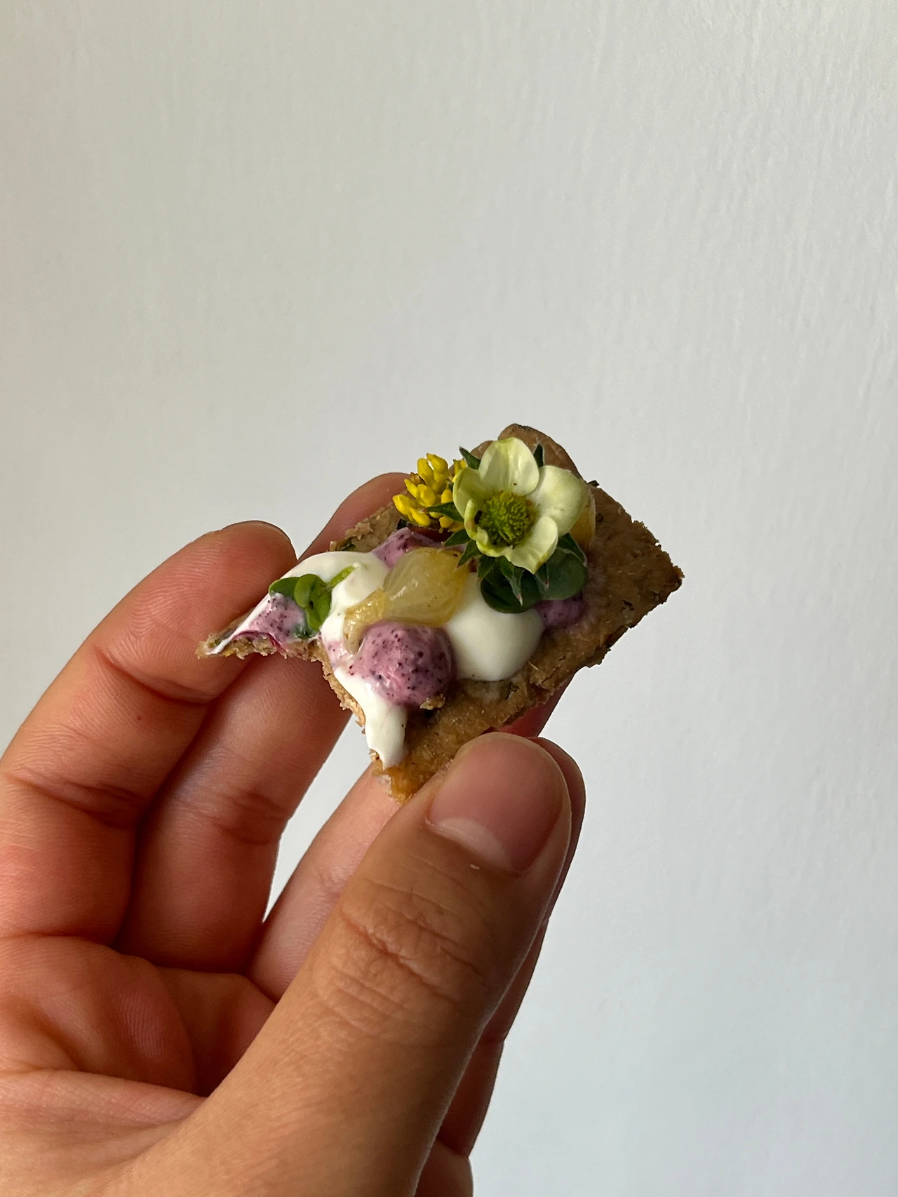 6. 크래커 위에 보랏빛 요거트 소스를 올리고, 구운 달래를 군데군데 얹는다. 그 위에 솎아낸 새싹들과 산수유꽃, 첫 딸기꽃, 후추를 뿌려 마무리한다.