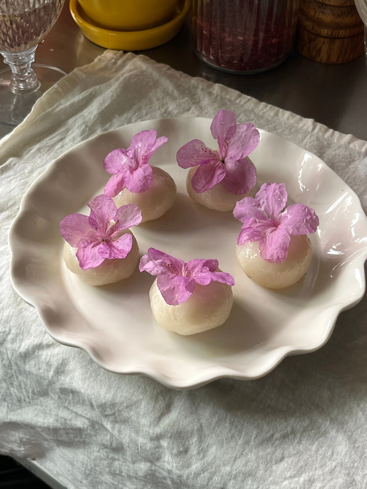 7. 가볍게 헹궈 물기를 제거한 진달래 꽃을 얹어 마무리한다.
