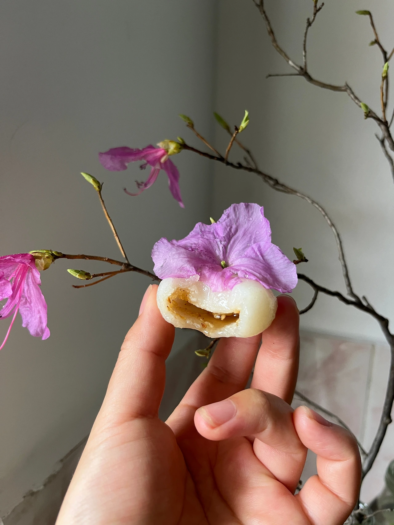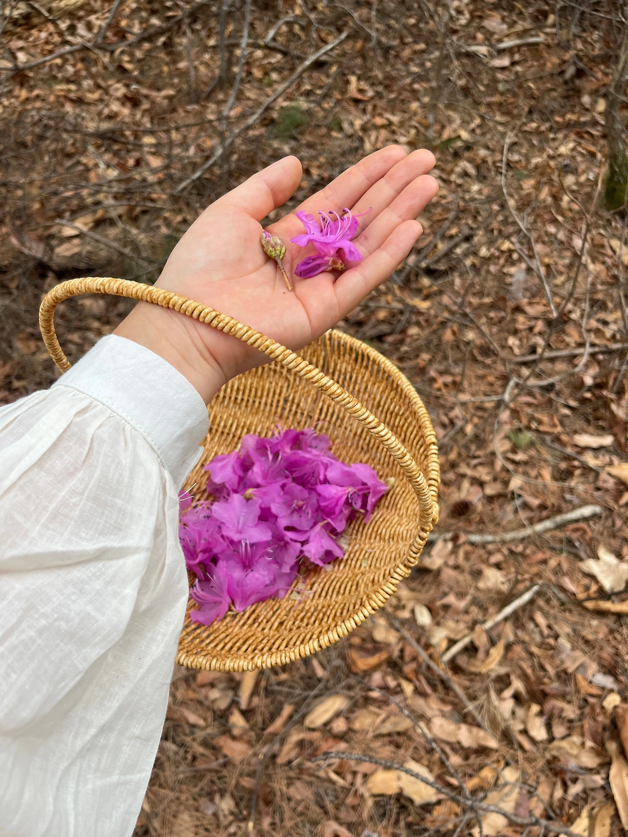 진달래 꽃잎은 얇아 찢어지기 쉽다. 조심히 꽃의 밑동을 뜯어내야 한다. 그렇게 딴 꽃은 금세 시들기에 오래 방치하는 것은 금물이다.