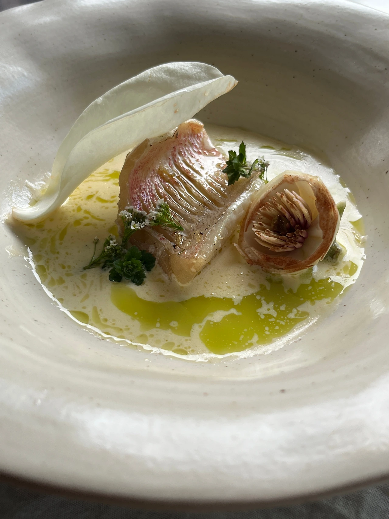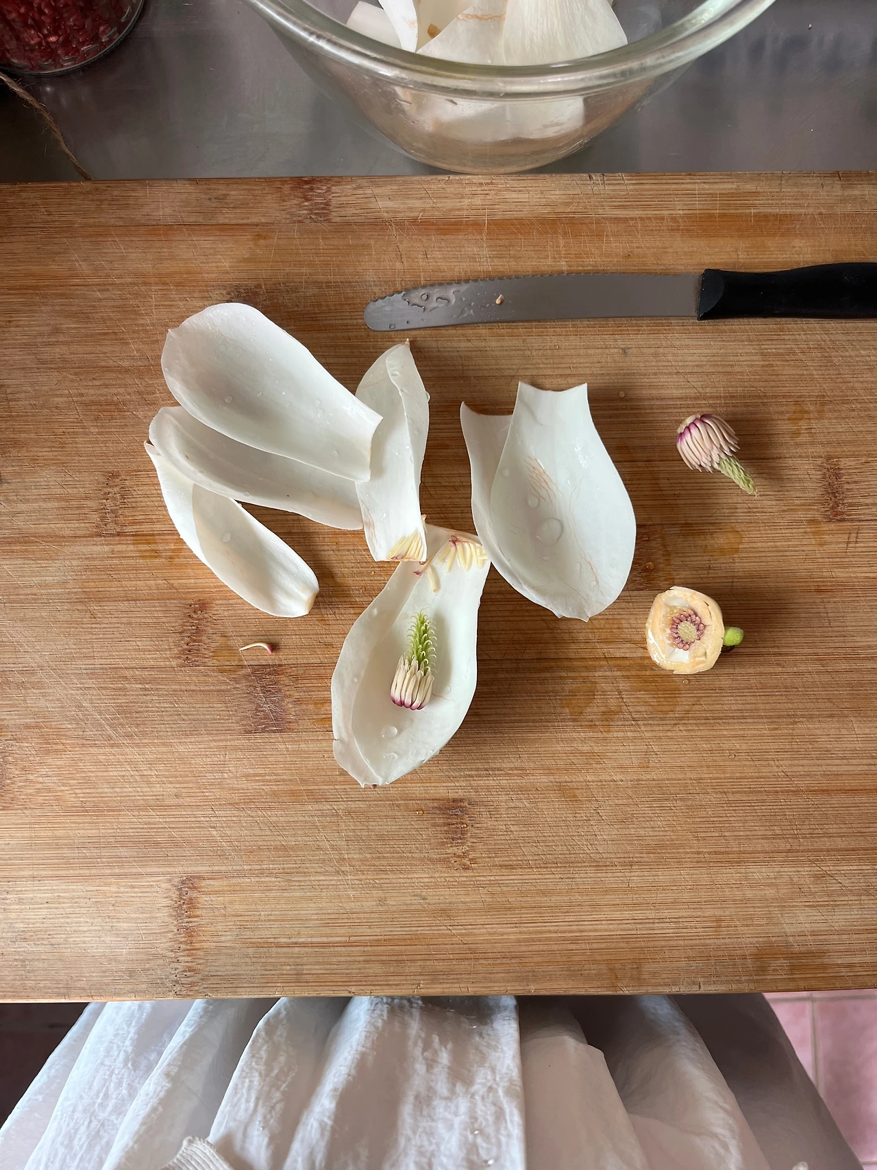 목련 뵈르블랑 : 목련 4개의 잎, 생크림50ml, 버터 60g, 화이트식초50ml, 화이트와인과 개복숭아주 혼합하여 200ml, 달래뿌리 한줌, 소금 1g