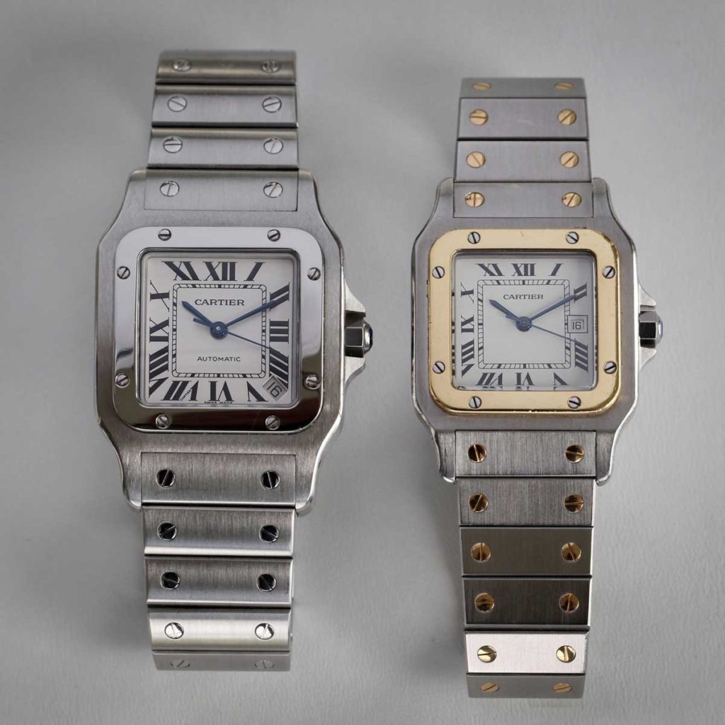 산토스 발매 100주년이었던 2004년, 까르띠에는 100주년 기념모델을 발매하였고 1년 뒤 2005년, 까르띠에는 산토스 갈베의 XL 모델을 출시합니다. 이 XL 모델은 32mm x 45.5mm 로서 이 역시 착용하기에 적절한 사이즈인데, 이 사이즈는 빅사이즈 워치가 유행이던 시기에 발매된 산토스 100주년 기념모델의 M 사이즈와 비슷한 정도의 사이즈입니다. 이후 현재의 2018년 까르띠에 모델의 M 사이즈도 이와 비슷한 정도의 사이즈로 출시되며 산토스의 크기를 이전보다는 크게 가져가는 움직임을 보여주고 있습니다.