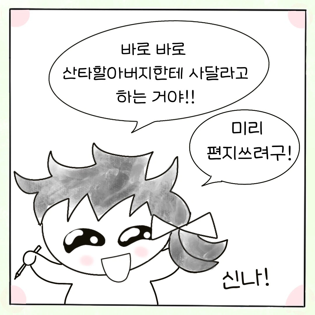 "바로바로 산타할아버지한테 사달라고 하는 거야! 미리 편지 쓰려고!"