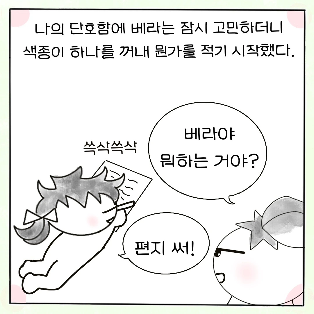 나의 말에 베라는 잠시 뭔가 고민하는 듯하더니 서랍의 색종이를 꺼내 열심히 끄적이기 시작했다.