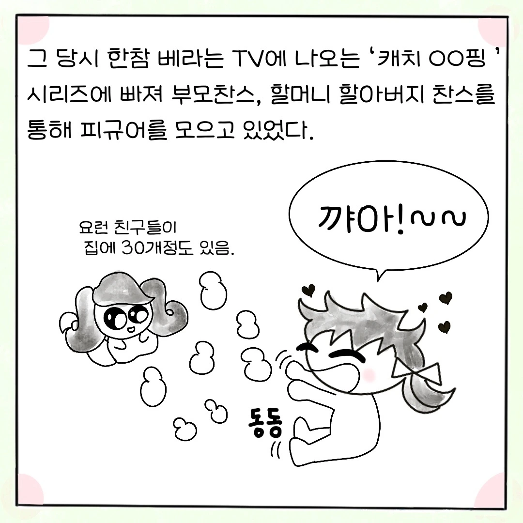 남편 과니와 나는 집에서는 TV를 아이에게 잘 안 보여주려고 했다. 하지만 베라가 하원 후 잠깐 친정부모님 댁에 있는 동안 TV를 통해 주기적으로 접한 후로 베라는 '캐치 ㅇㅇ핑' 시리즈에 푹 빠져버렸다.