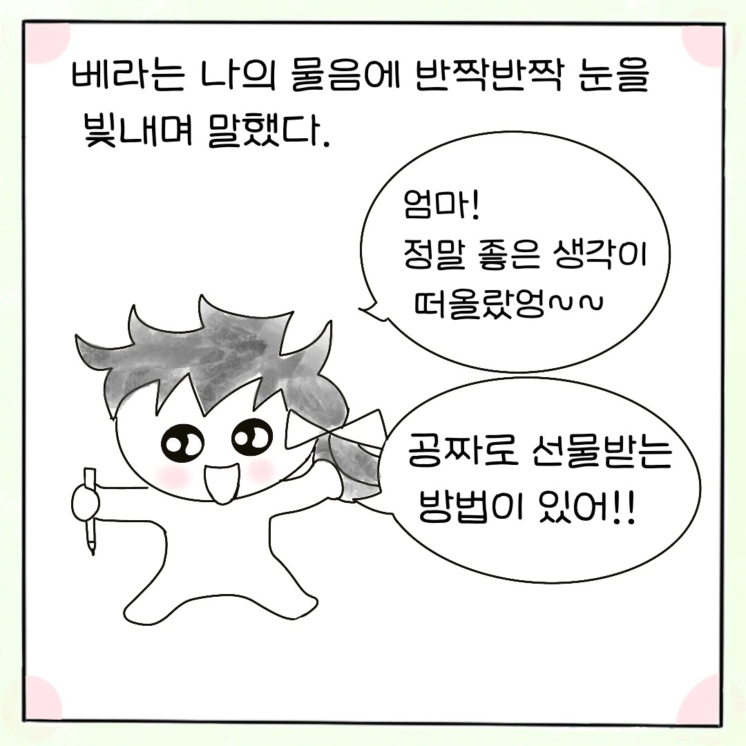 "엄마 나 정말 좋은 생각이 떠올랐어! 공짜로 선물 받는 방법이 있어!"