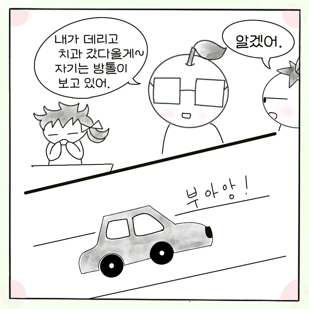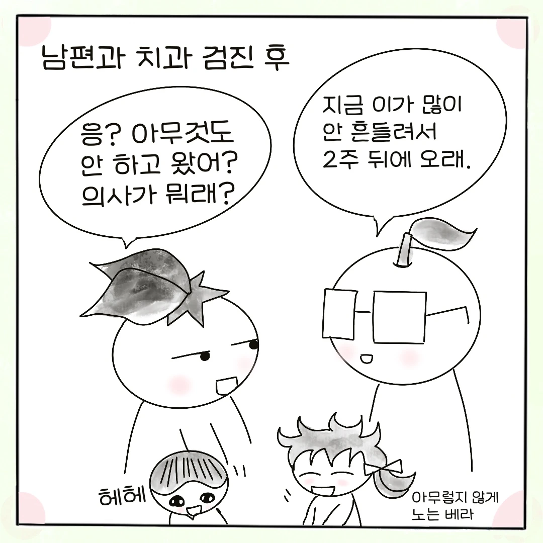 "내가 베라 데리고 치과 갔다 올게. 자기는 방톨이 보고 있어."