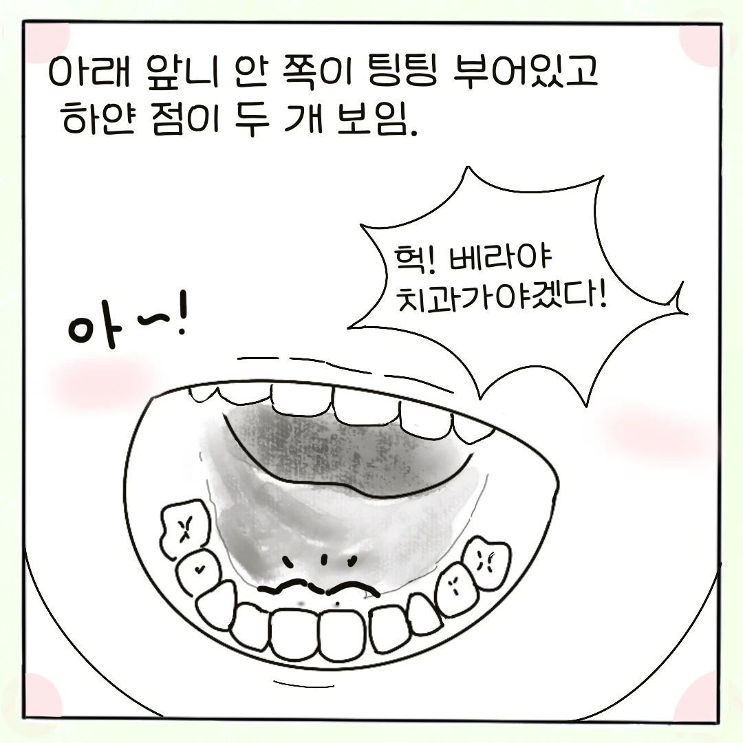 자세히 보니 부어있는 잇몸 안쪽에서 희미한 하얀 점이 두 개가 보였다!