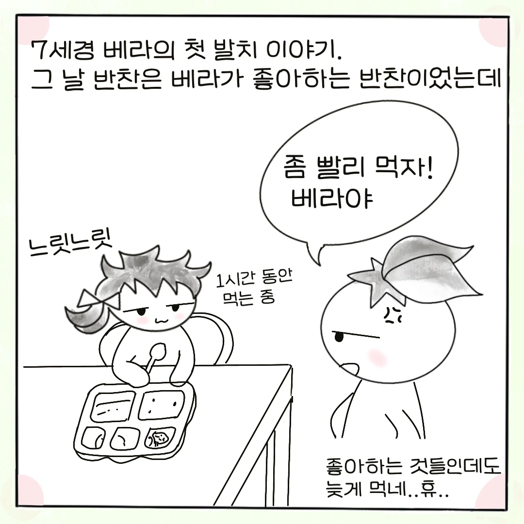 그날따라 첫째 베라가 유독 더 식사시간이 길었다. 브로콜리, 치킨, 숙주나물 등 특별히 좋아하는 반찬 위주로 구성되어 있는 식단이었는데도 말이다. 시계를 보니 밥 차려준지 벌써 1시간이 다 되어갔다.