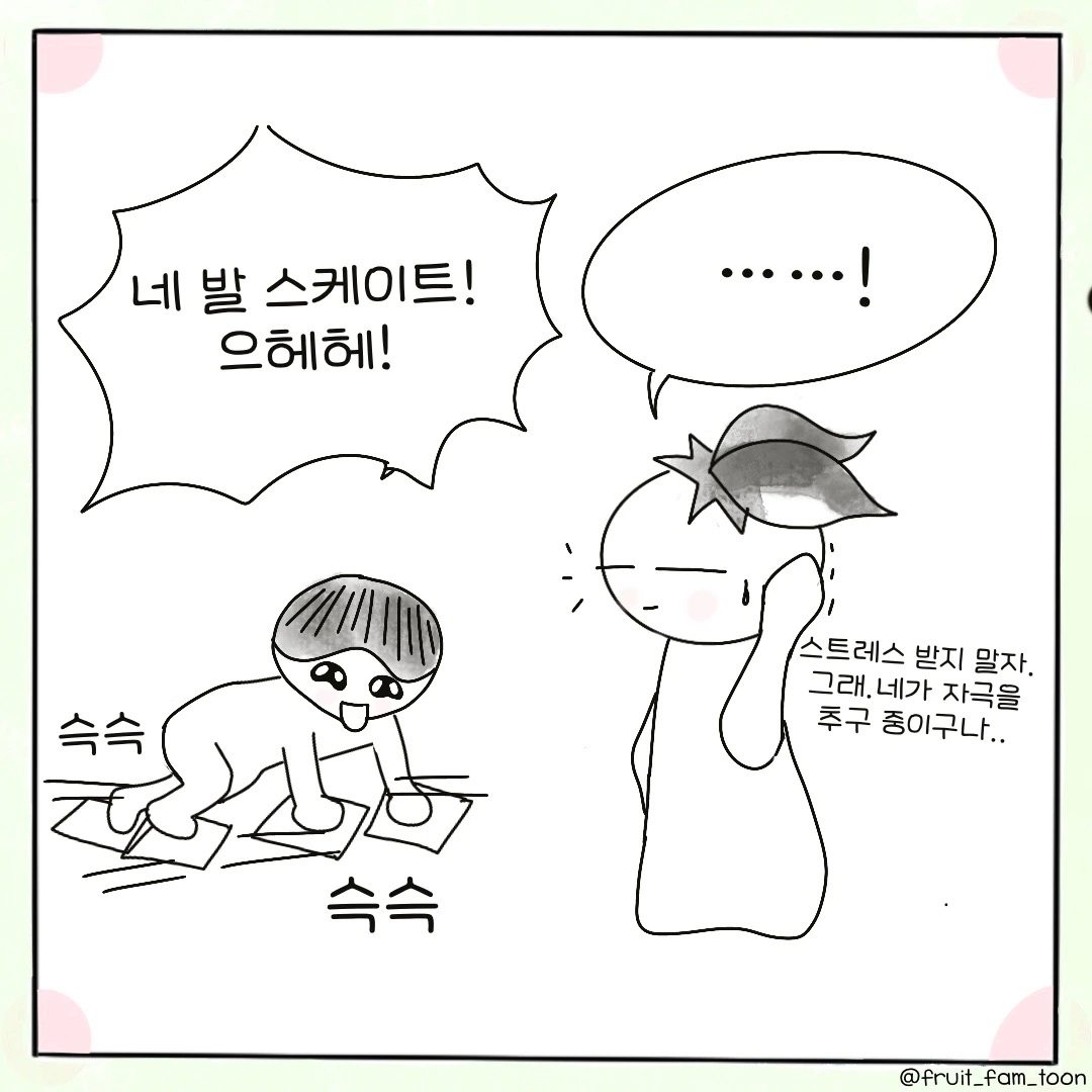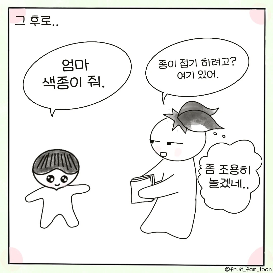 그러자 신나게 색종이 스케이트를 타고, 에너지를 금방 소진한 방톨이 사과를 먹으러 다가왔다. 그렇게 나의 고음 소리 없이 색종이 스케이트 해프닝이 일단락이 되었다.