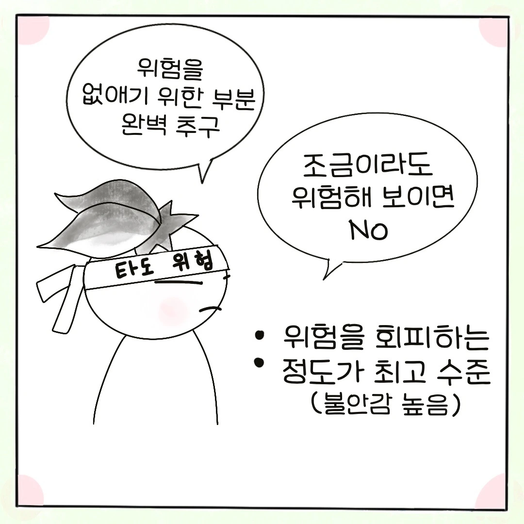 나는 위험을 회피하는 정도가 최고 수준이었다. 불안감이 높아 위험을 없애기 위해서라면 완벽을 추구하고, 조금이라도 위험해 보이면 시도하지 않는다고 했다.